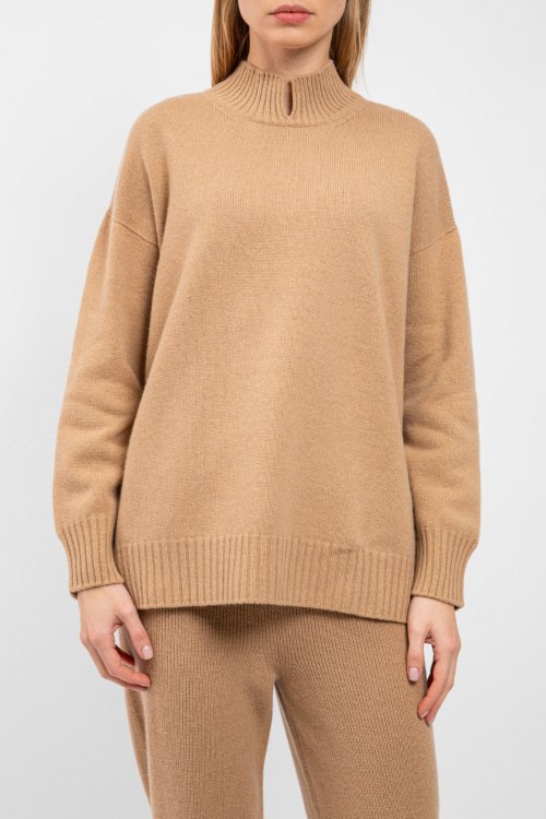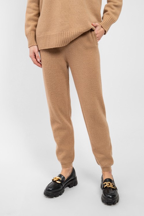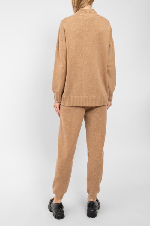 Женский коричневый прогулочный костюм из микса шерсти, шелка и кашемира от If What (Иф Уот). Джемпер с воротник-стойкой, приспущенная линия плеча, длинные рукава, трикотажная резинка на манжетах и по низу изделия, брюки с трикотажной резинкой на манжетах, средняя посадка, эластичная резинка на поясе с кулиской, прорезные карманы.
