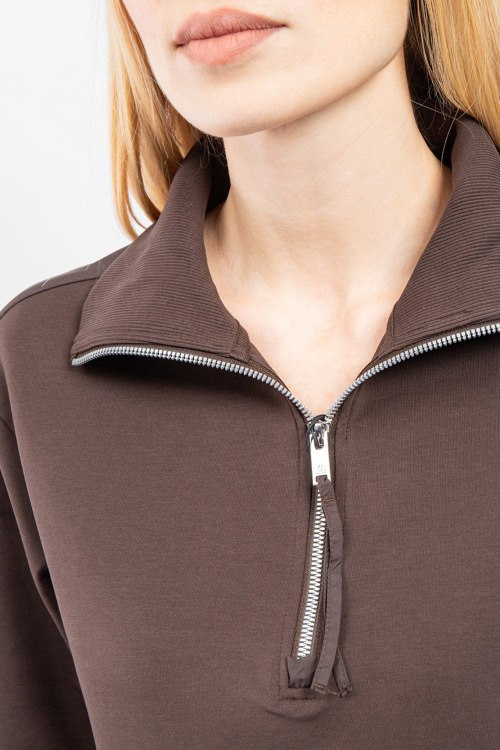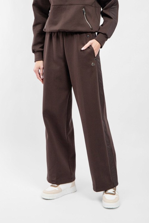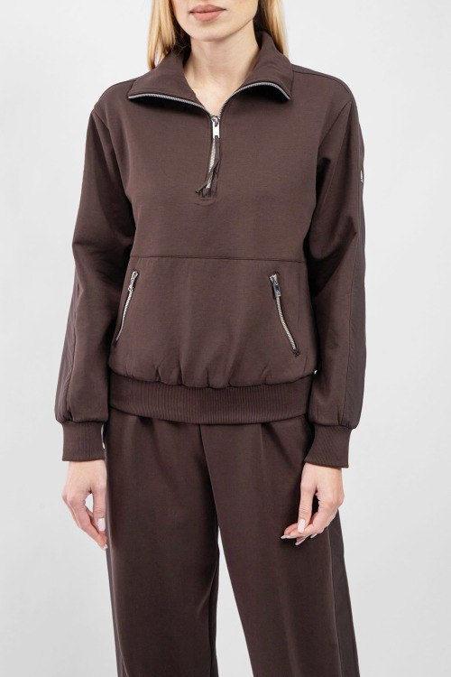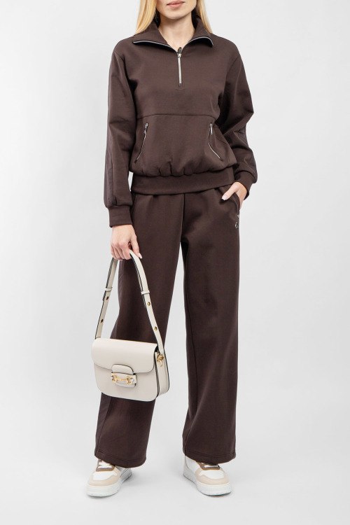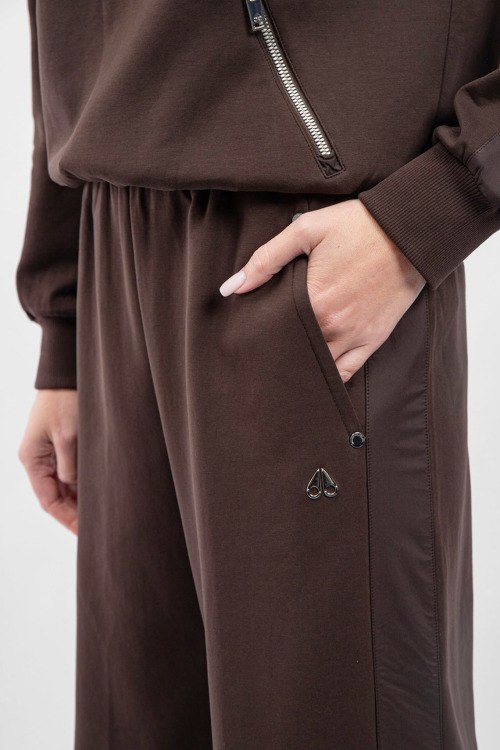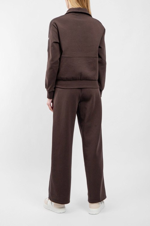 Женский темно-коричневый хлопковый прогулочный костюм от Moose Knuckles (Мус Наклс). Джемпер: отложной воротник с застежкой на молнию, нашивка с логотипом на рукаве, карман на молнии, классическая длина, трикотажные манжеты и нижний край. Брюки: эластичный пояс, боковые карманы, нашивка с логотипом, лампасы, наз без манжетов, полная длина.