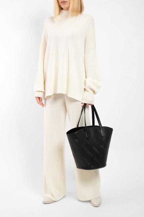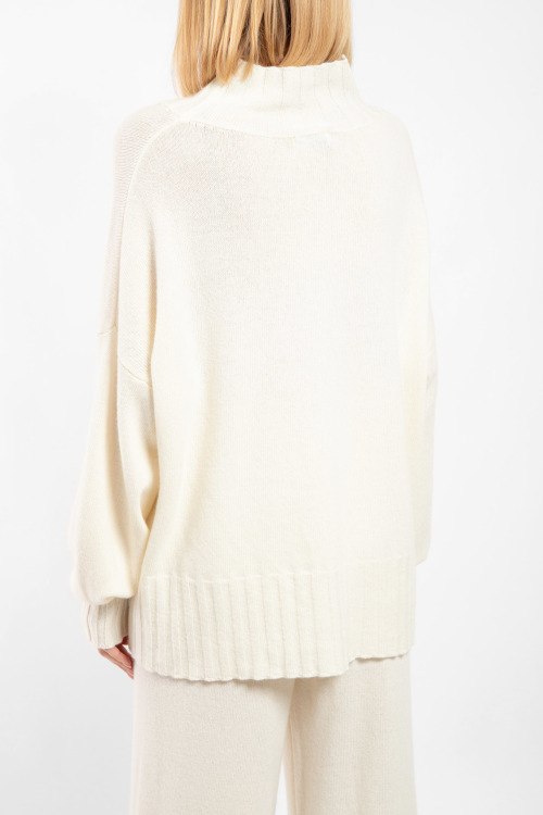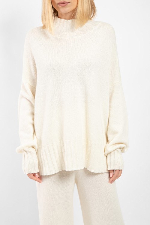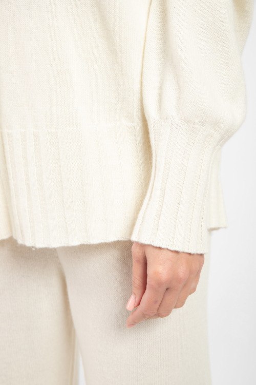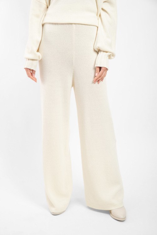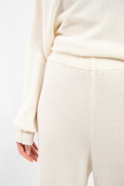Женский костюм молочного оттенка из шерсти и кашемира от Clothe (Клозе). Джемпер свободного силуэта, воротник-стойка, длинные рукава, приспущенная линия плеча, трикотажная резинка на манжетах и по низу изделия, брюки классической длиной, высокая посадка, эластичная резинка на поясе, расклешенная модель от бедра. Измерения: длина кофты: 71 см, ширина по груди: 68 см, ширина по талии: 66 см, длина рукава по внутреннему шву: 50 см, ширина рукава: 20 см, длина брюк: 116 см, ширина по талии: 42 см, ширина по бедрам: 47 см, высота сидения 41 см, ширина штанины вверху: 32 см.