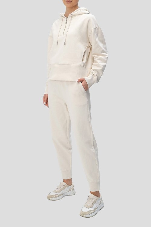 Женский спортивный костюм Emrey молочного оттенка из хлопка от Hugo Boss (Хуго Босс). Худи с капюшоном с кулиской, длинные рукава, манжеты и низ изделия в рубчик, горловина на молнии, спортивные брюки зауженного кроя, прорезные карманы, эластичная резинка по поясе