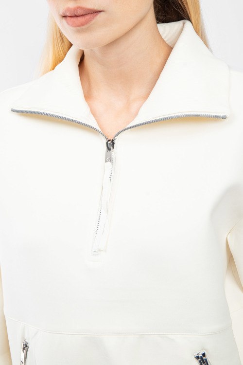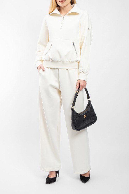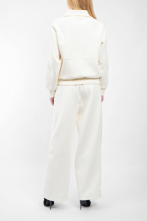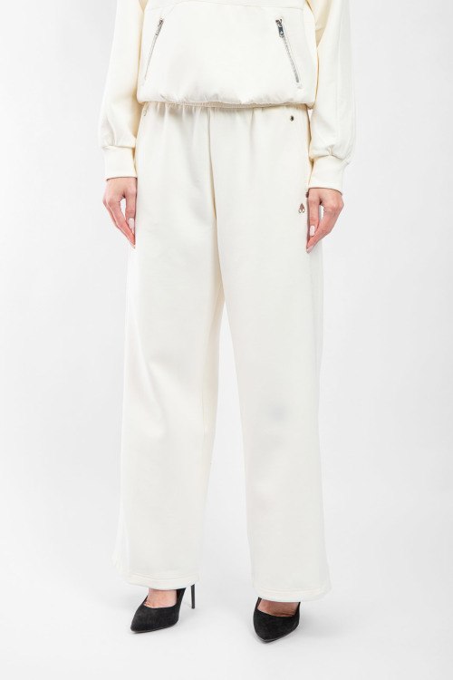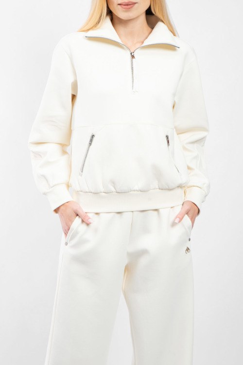 Женский хлопковый прогулочный костюм молочного оттенка от Moose Knuckles (Мус Наклс). Джемпер: отложной воротник с застежкой на молнию, нашивка с логотипом на рукаве, карман на молнии, классическая длина, трикотажные манжеты и нижний край. Брюки: эластичный пояс, боковые карманы, нашивка с логотипом, лампасы, наз без манжетов, полная длина.