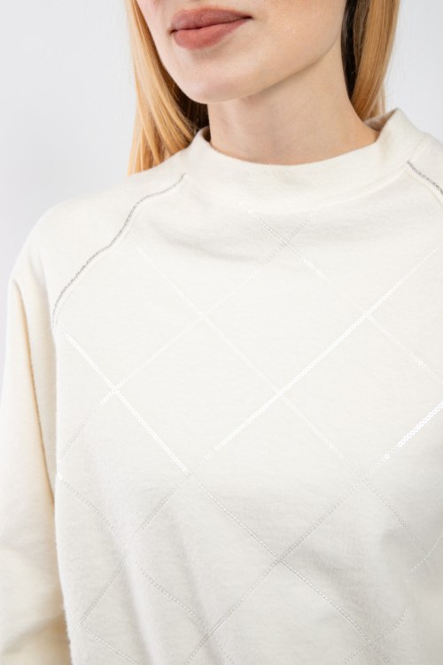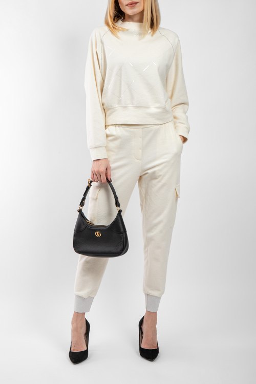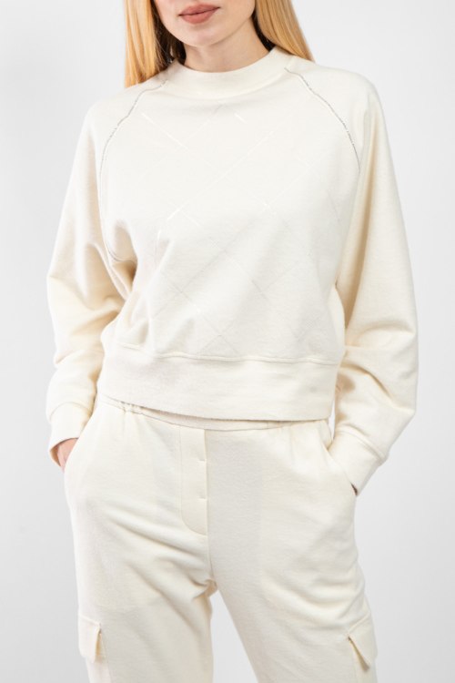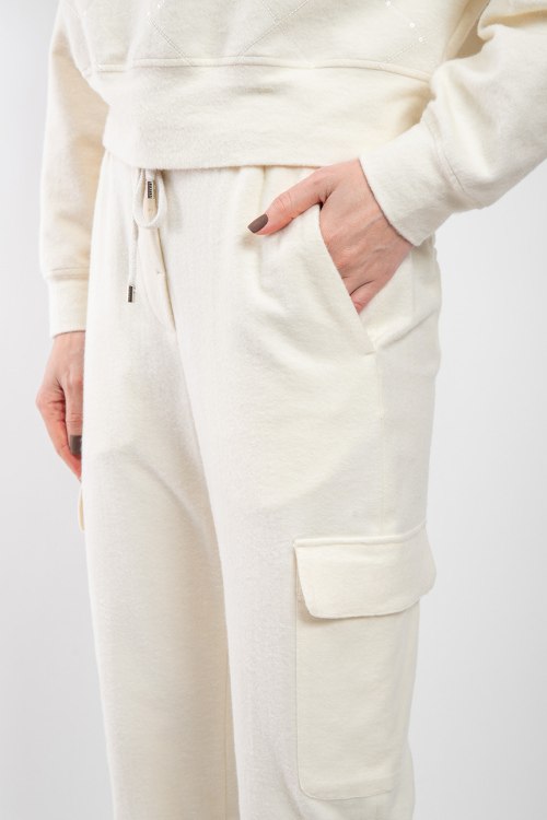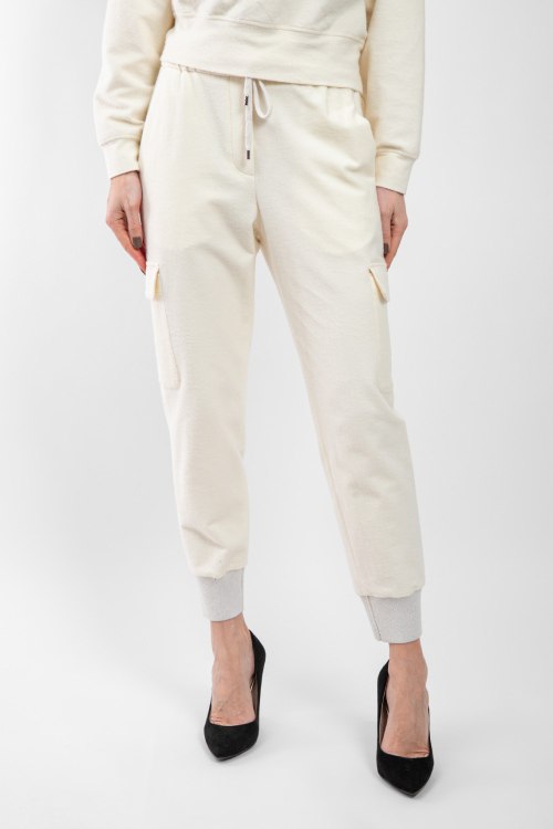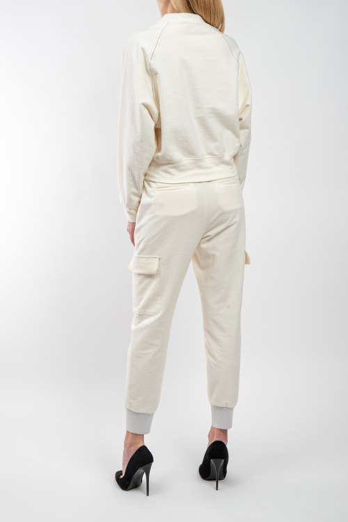 Женский костюм молочного оттенка из хлопкового микса от Peserico (Пезерико). Свитшот с рукавами-реглан, трикотажная резинка на манжетах и по низ изделия, брюки-карго с эластичной резинкой на манжетах, высокая посадка, трикотажная резинка на поясе с кулиской, прорезные карманы, два кармана с клапаном по бокам.
