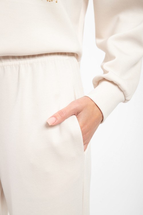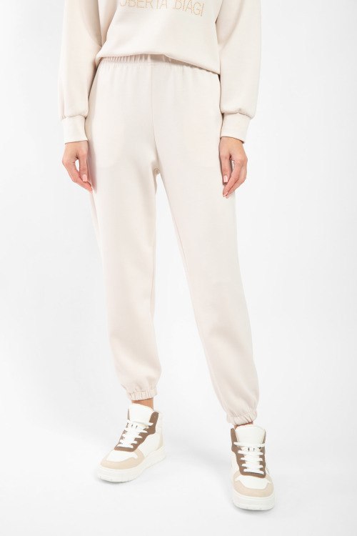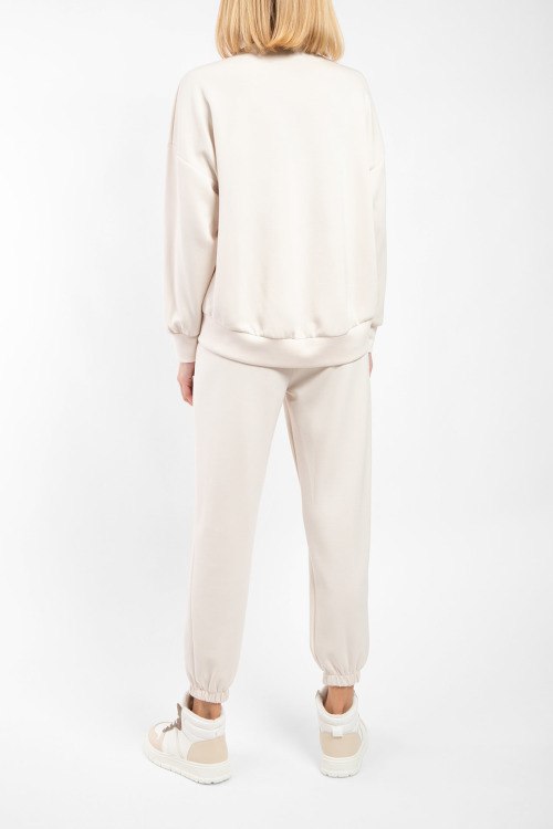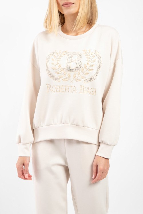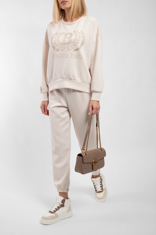 Женский спортивный костюм из молочного оттенка из вискозы и полиэстера от Roberta Biagi (Роберта Бьяджи). Свитшот с аппликацией из кристаллов в виде логотипа бренда, длинные рукава, трикотажная резинка на манжетах и по низу изделия, спортивные брюки с эластичной резинкой на манжетах. прорезные карманы, эластичная резинка на поясе. Измерения: длина кофты: 57 см, ширина по груди: 63 см, длина рукава по внутреннему шву: 42 см, ширина рукава: 23 см, длина брюк: 98 см, ширина по талии: 34 см, ширина по бедрам: 48 см, высота сидения 36 см, ширина штанины вверху: 29 см.