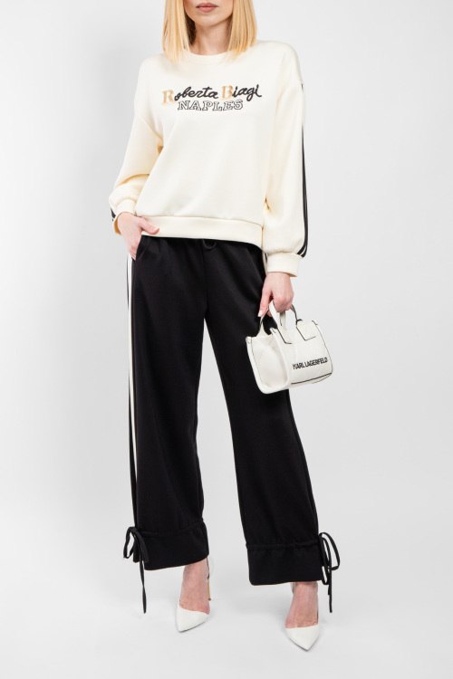 Женский черно-бежевый костюм из вискозы, полиэстера и эластана от Roberta Biagi (Роберта Бьяджи). Свитшот с принтом, круглый вырез горловины, трикотажная резинка на манжетах и по низу изделия, брюки черного цвета свободный крой, кулиски на манжетах, прорезные карманы. Замеры для размера UNI: кофта: длина: 57 см, ширина по груди 56 см, ширина по талии 56 см, длина рукава 43 ширина рукава 22 см. Брюки: длина: 101 см, ширина штанины вверху 34 см, высота сидения 36 см, ширина по поясу (резинка) 34 см, ширина по бедрам 47 см.