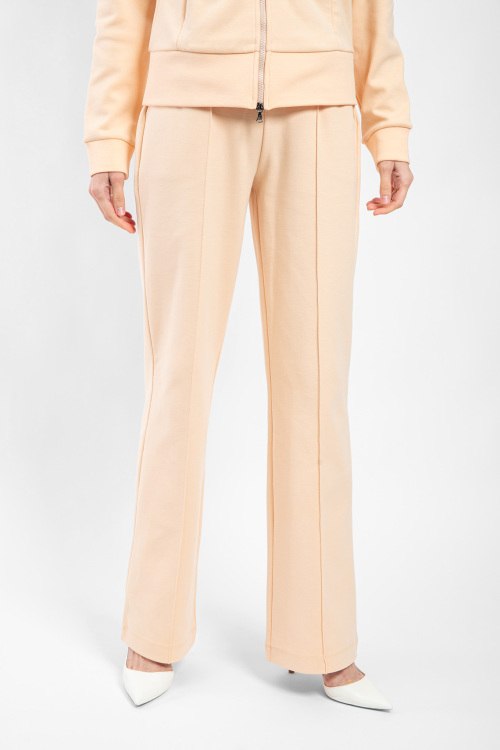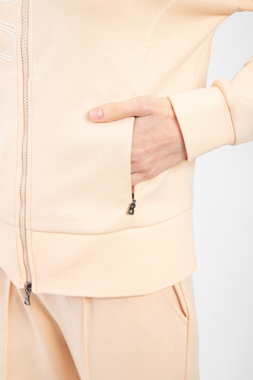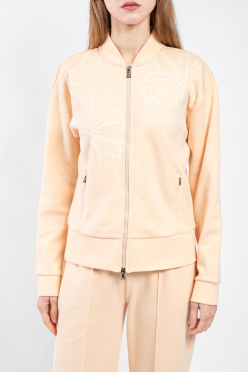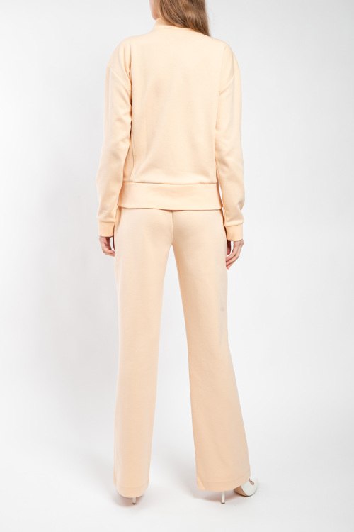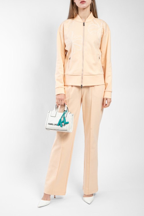 Детали: Женский персиковый хлопковый костюм Emm от Bogner (Богнер). Кофта: вышитый цветочный узор, воротник-стойка, боковые карманы на молнии, застежка-молния, классическая длина. Брюки: эластичный пояс на завязках, боковые карманы, расклешенный фасон, полная длина