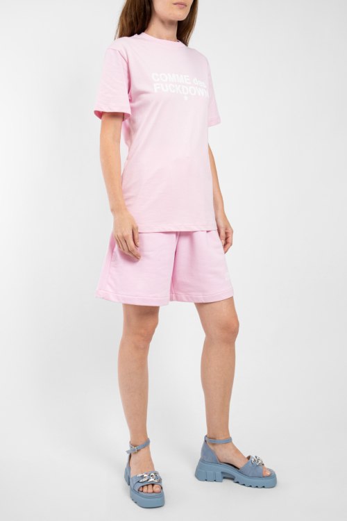 Женский розовый прогулочный костюм из хлопка от Comme des Fuckdown (Камм дес Факдаун). Футболка с круглым вырезом, короткие рукава, принт с логотипом бренда на груди, спортивные шорты с высокой посадкой, эластичная резинка на поясе с кулиской, свободный силуэт, боковые карманы, принт с логотипом бренда.