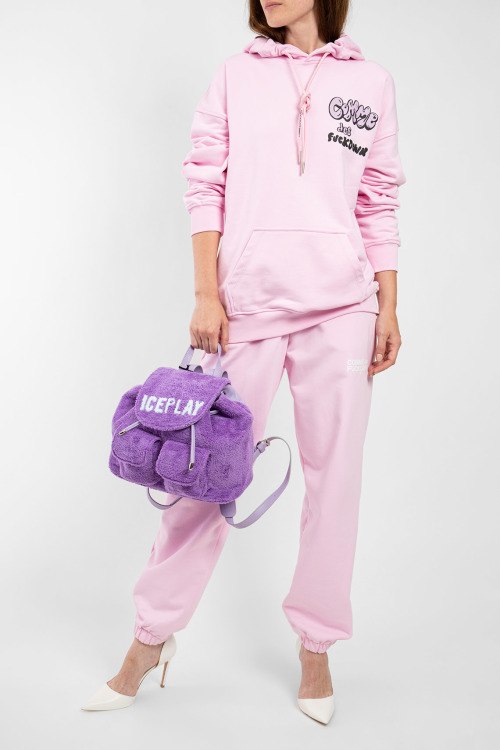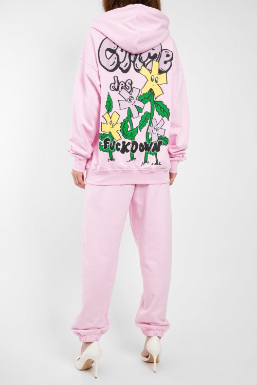 Женский розовый хлопковый прогулочный костюм от Comme des Fuckdown (Камм дес Факдаун). Худи: капюшон на завязках, принт с логотипом спереди и сзади, карман-кенгуру, классическая длина, трикотажные манжеты и нижний край. Брюки: эластичный пояс на завязках, принт с логотипом, боковые карманы, внизу на манжетах, полная длина.