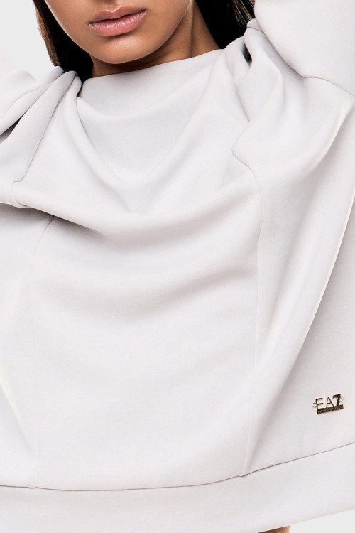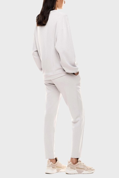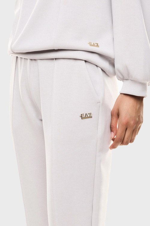 Детали: Женский светло-серый прогулочный костюм от EA7 Emporio Armani (ЕА7 Эмпорио Армани). Свитшот: нашивка с логотипом, круглый вырез горловины, классическая длина, трикотажные манжеты и нижний край. Брюки: эластичный пояс, боковые карманы, низ без манжетов, полная длина