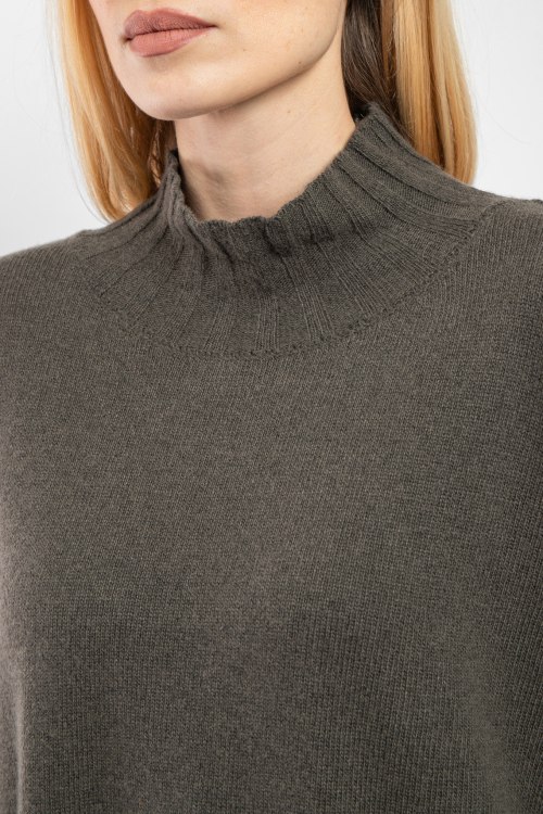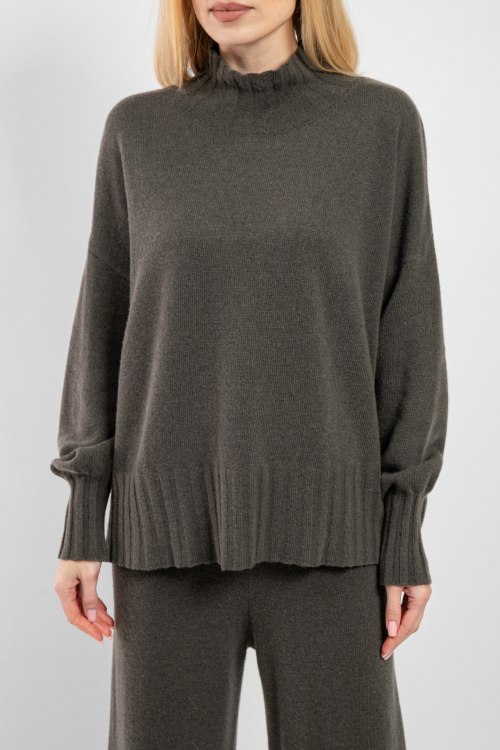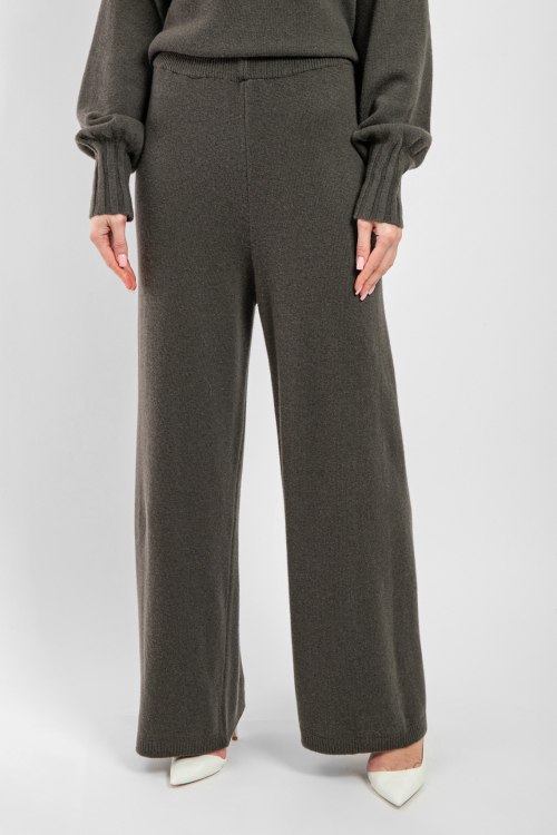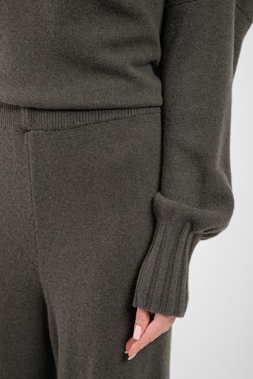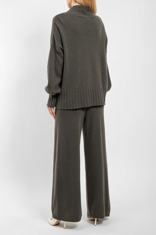 Женский темно-серый костюм из шерсти и кашемира от Clothe (Клозе). Джемпер: высокая горловина, спущенная линия плеча, классическая длина. Брюки: эластичный пояс, широкий крой, полная длина.