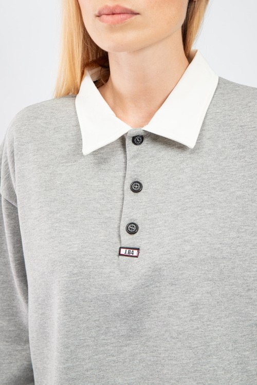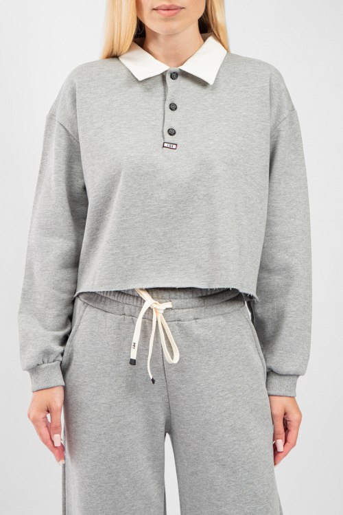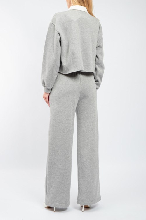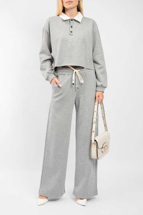 Женский серый хлопковый прогулочный костюм от J.B4 Just Before (Джаст Бифо). Джемпер-поло: отложной воротник, застежка на три пуговицы, трикотажные манжеты, укороченная длина. Брюки: эластичный пояс на завязках, боковые карманы, широкий крой, полная длина.