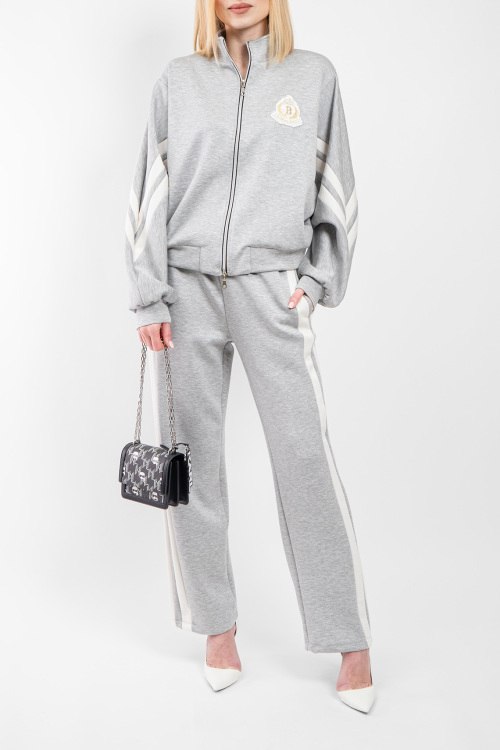 Женский серый спортивный костюм из полиэстера и района от Roberta Biagi (Роберта Бьяджи). Спортивная кофта на молнии, воротник-стойка, застежка на молнию, дизайн с лампасами, нашивка с логотипом бренда, трикотажная резинка на манжетах и по низу изделия, спортивные брюки классической длина, высокая посадка, эластичная резинка на поясе с кулиской, прорезные карманы. Замеры для размера UNI: кофта: длина: 58 см, ширина по талии 54 см, ширина рукава 39 см Брюки: длина: 102 см, ширина штанины вверху 32 см, высота сидения 32 см, ширина по поясу (резинка) 34,5 см, ширина по бедрам 48 см.
