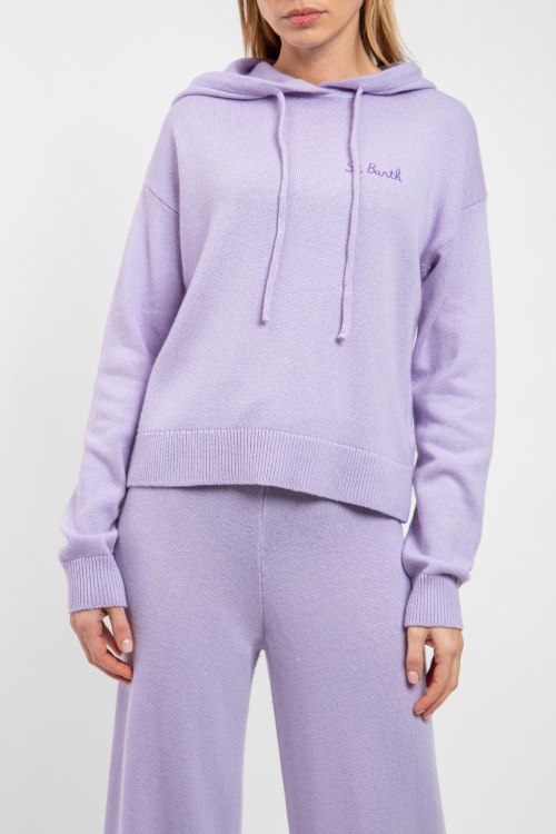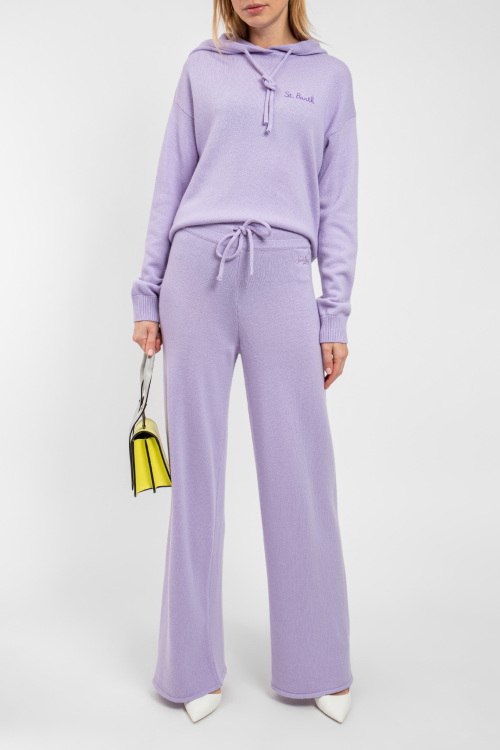 Женский сиреневый прогулочный костюм из шерсти и вискозы от Mc2 Saint Barth (Mc2 Сент Барт). Худи: вышитый логотип, капюшон на завязках, классическая длина, манжеты и нижний край в рубчик. Брюки: эластичный пояс на завязках, вышитый логотип, широкий крой, полная длина.
