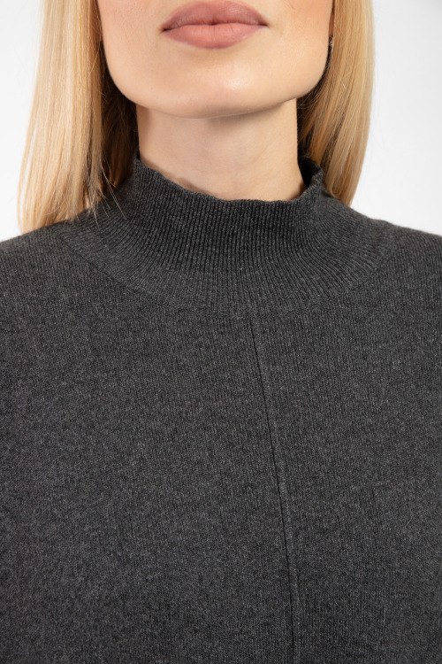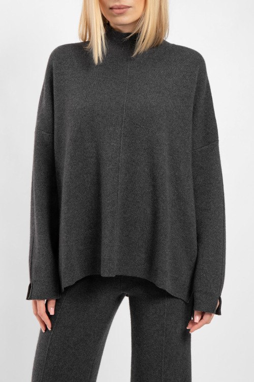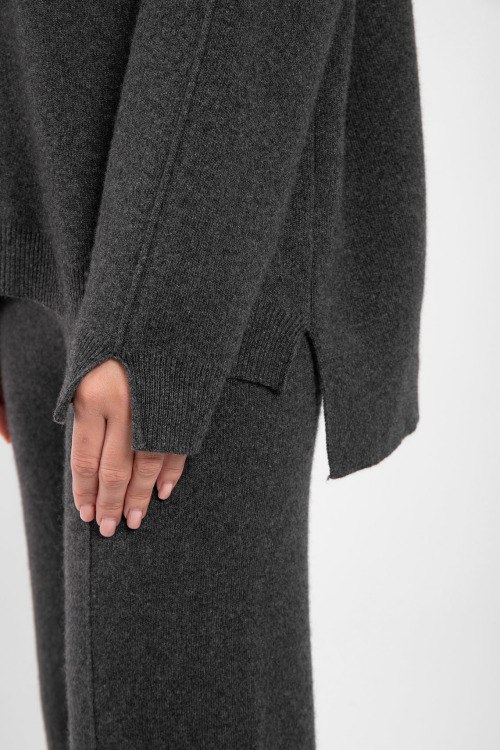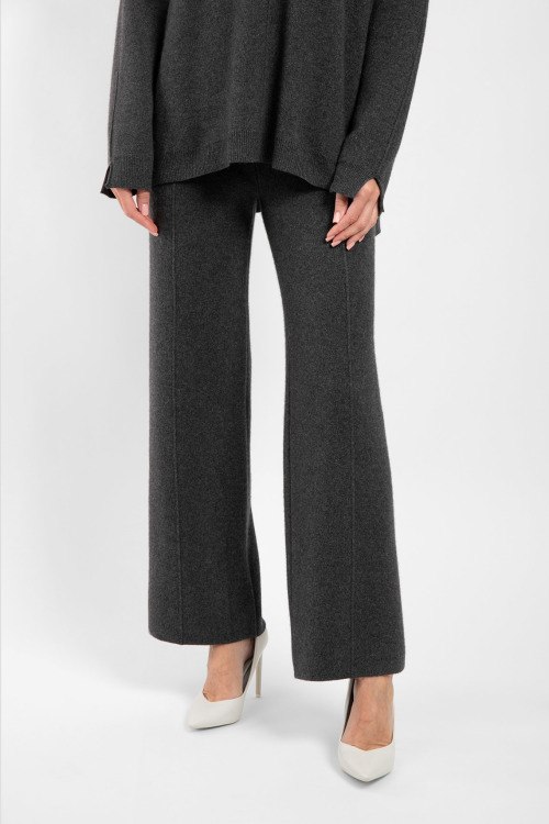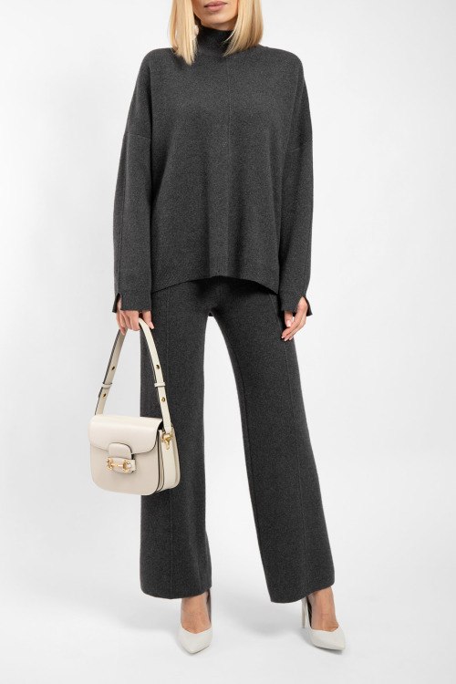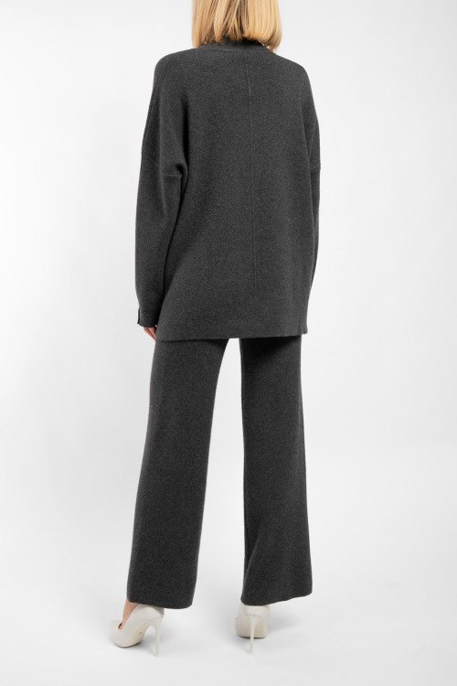 Женский темно-серый костюм из шерстяного микса от Barbara Alvisi (Барбара Алвиси). Джемпер с высокой горловиной, длинные рукава, манжеты с разрезами, расклешенные брюки, эластичная резинка на поясе. Измерения: длина кофты: 70 см, ширина по груди: 71 см, ширина по линии талии: 68 см, длина рукава по внутреннему шву: 43 см, ширина рукава: 19 см, длина брюк: 109 см, ширина по талии: 36 см, ширина по бёдрам: 42 см, высота сидения 34 см, ширина штанины вверху: 27 см.