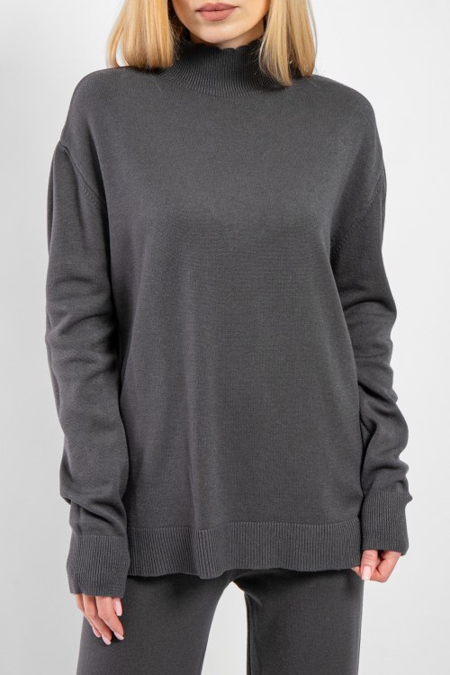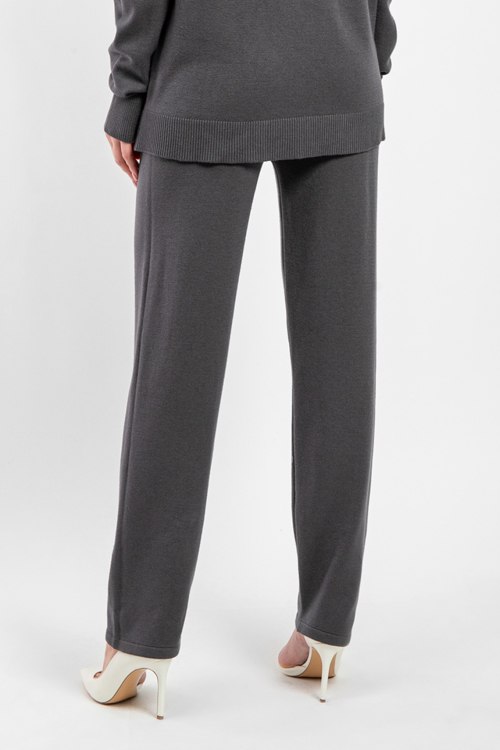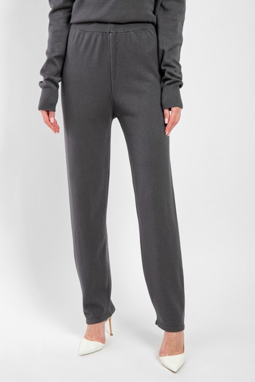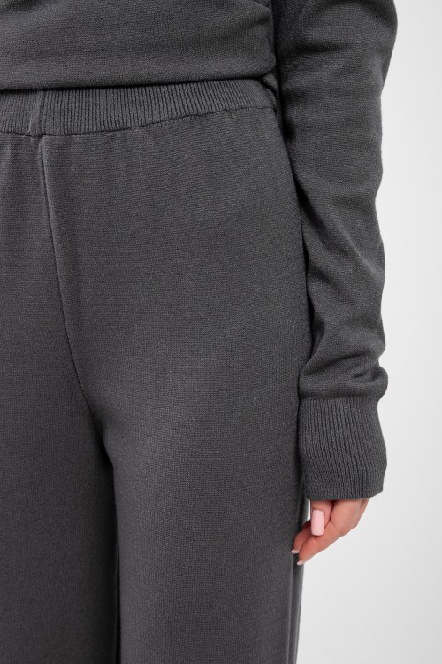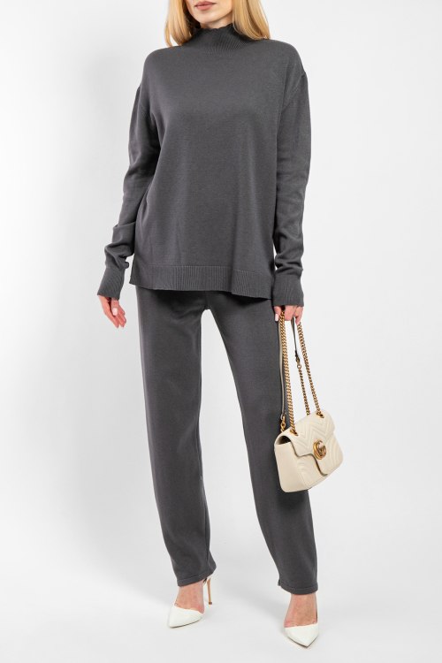 Женский темно-серый трикотажный костюм от Clothe (Клозе). Джемпер: высокая горловина, спущенная линия плеча, классическая длина, манжеты и нижний край в рубчик. Брюки: эластичный пояс, прямой крой, полная длина.