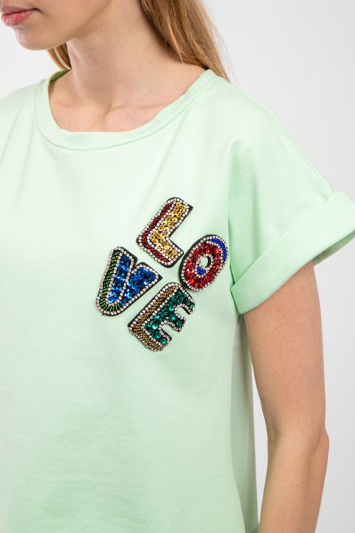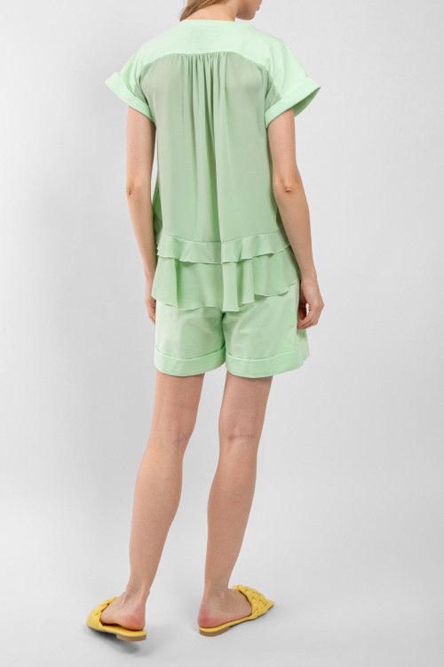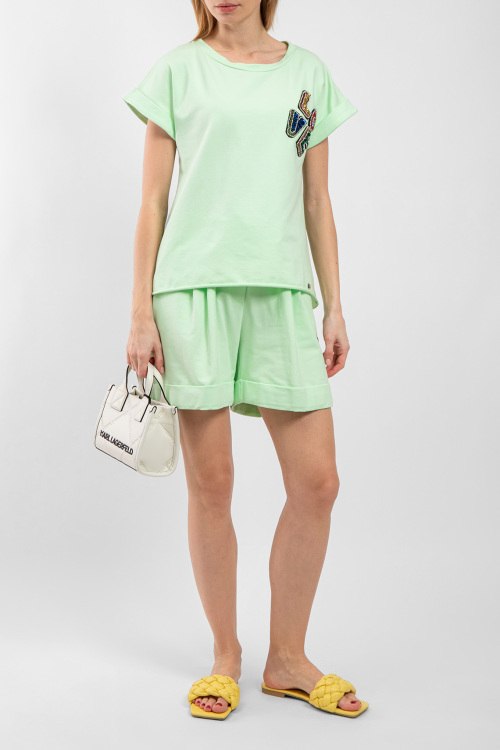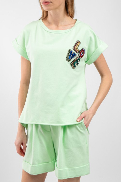 Женский фисташковый хлопковый костюм от Chiara Dalba (Кьяра Далба). Футболка: аппликация из бисера и пайеток на груди, круглый вырез горловины, короткий рукав, классическая длина. Шорты: эластичный пояс на завязках, боковые карманы, короткая длина. Замеры для размера M футболки: Длина: 54 см, ширина по груди: 48 см, ширина по талии: 46 см. Замеры шорт: длина 42 см, ширина по поясу 35 см (резинка), ширина по бёдрам: 45 см, высота сидения: 36 см, ширина штанины внизу: 34 см.