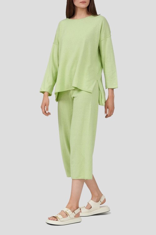 Женский светло-зеленый костюм из льна и хлопка от Deha (Деха). Джемпер: круглый вырез горловины, разрезы по бокам, асимметричный нижний край. Брюки: эластичный пояс на завязках, боковые карманы, укороченная длина. Параметры модели: 78-62-92, рост 179 см. На модели надет: S размер