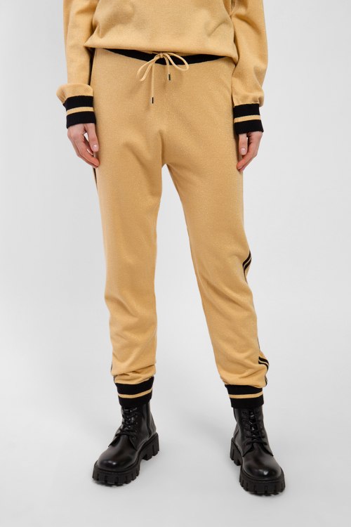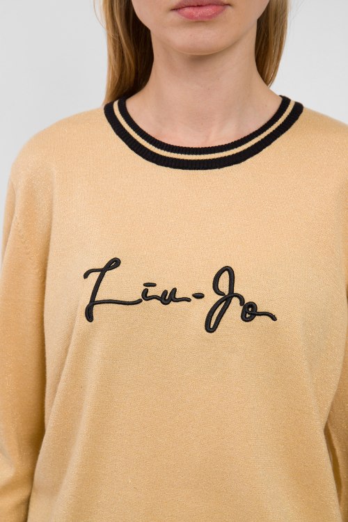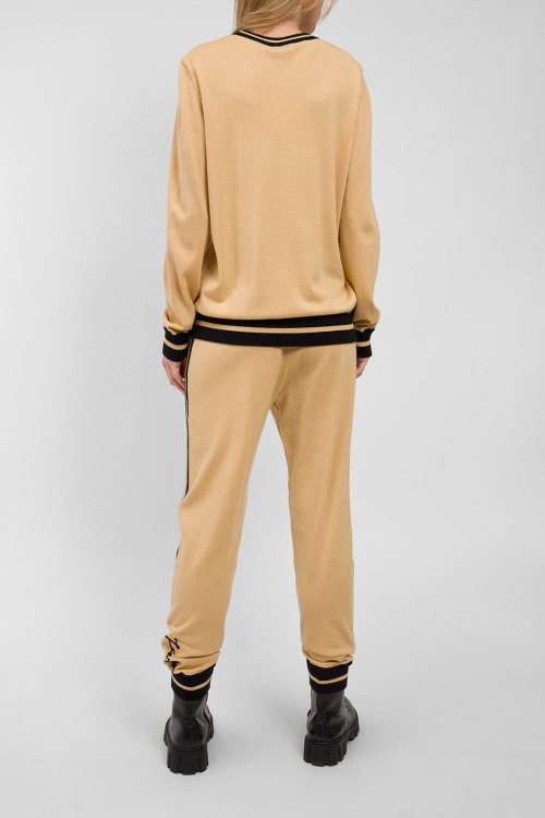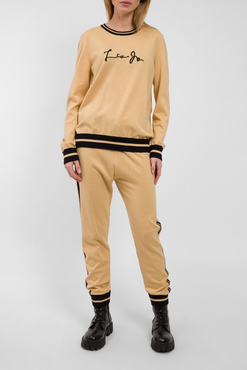 Женский бледно-желтый прогулочный костюм из микса вискозы с люрексом от Liu Jo (Лиу Джо). Джемпер: вышитый логотип на груди, круглый вырез горловины, классическая длина, манжеты и нижний край в рубчик. Брюки: трикотажный пояс на завязках, черные лампасы, трикотажные манжеты, полная длина.