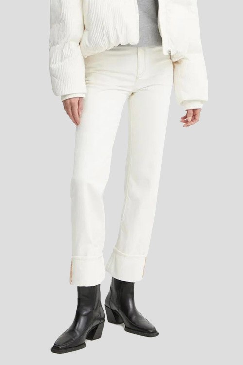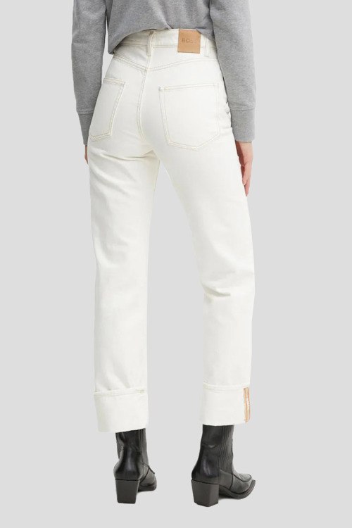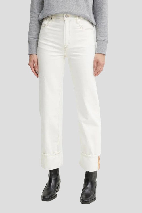 Детали: Женские белые джинсы из хлопка от Hugo Boss (Хуго Босс). Прямой силуэт, высокая посадка, застежка на молнию, манжеты с отворотом, логотип бренда, патч-лого