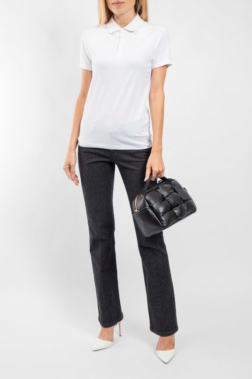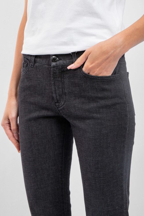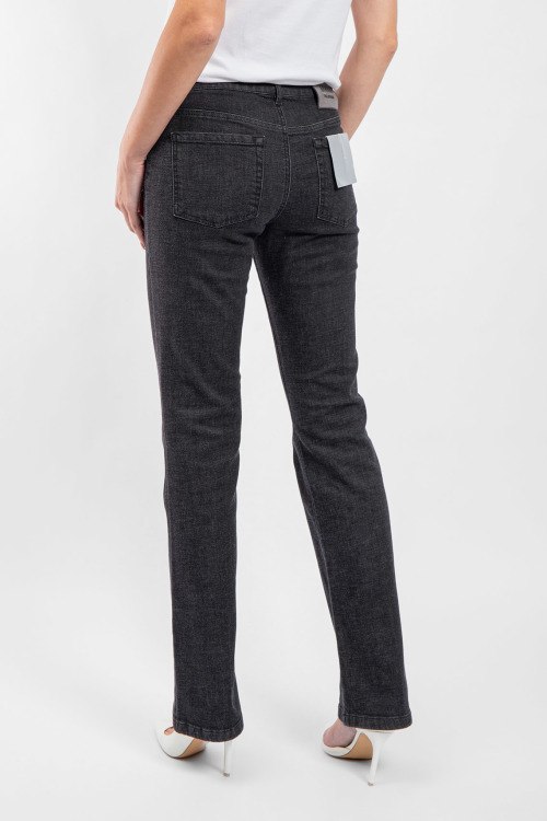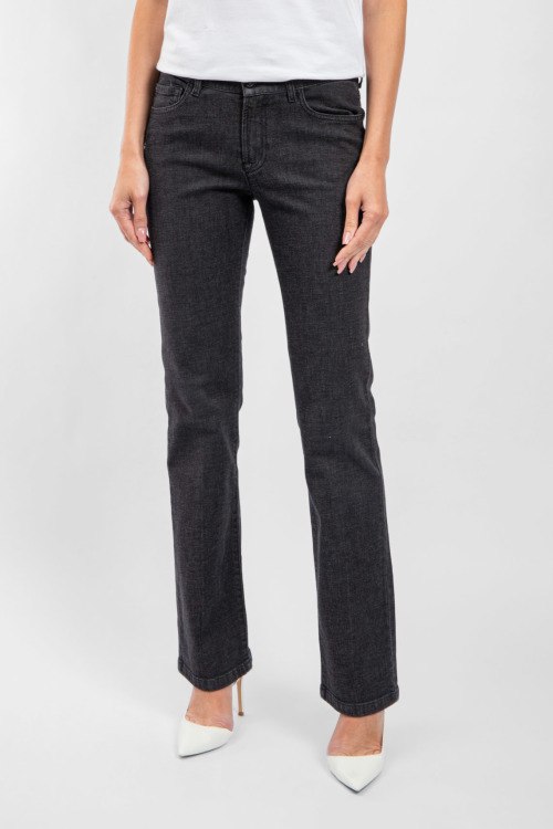 Детали: Женские черные джинсы из микса хлопка и кашемира от Armani Collezioni (Армани Коллезиони). Пяти-карманная модель, прямой фасон, застежка на пуговицу и молнию, петли для ремня на поясе, патч-лого сзади