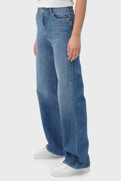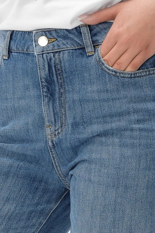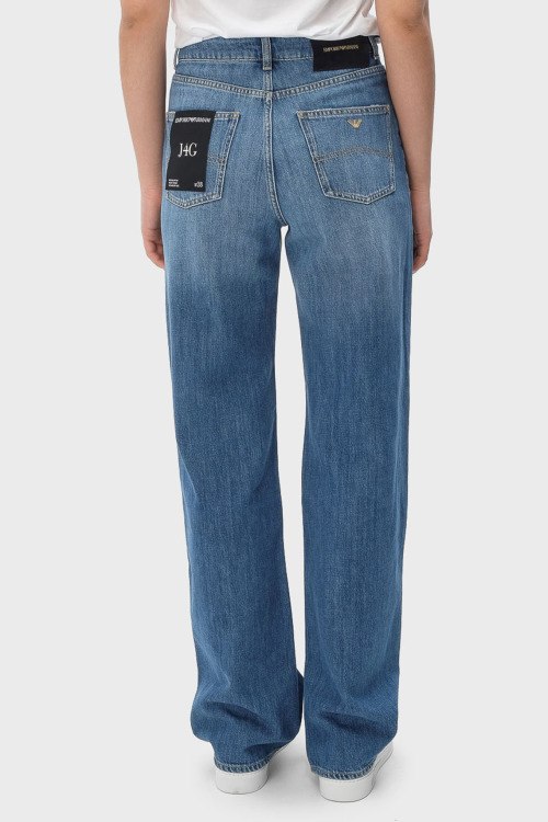Детали: Женские голубые джинсы J4G из хлопка от Emporio Armani (Эмпорио Армани). Классическая длина, высокая посадка, застежка на молнию и пуговицу, пять карманов, петли в поясе для ремня, патч-лого