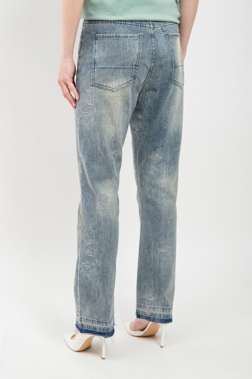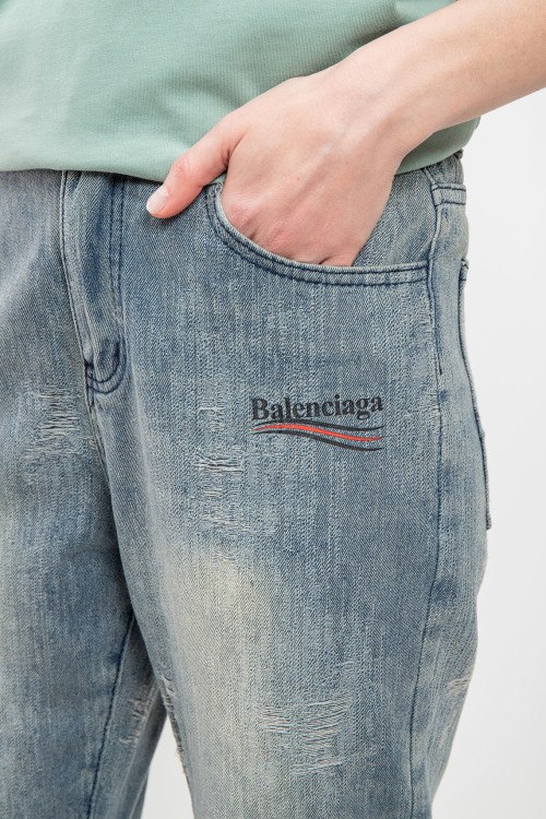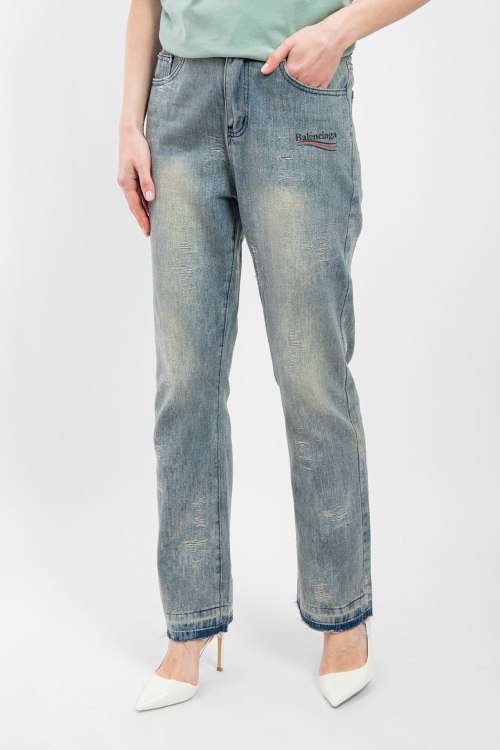 Женские голубые джинсы от Balenciaga (Баленсиага). Пяти-карманная модель, дизайн с потертостями, пояс с петлями для ремня, принт с логотипом, прямой крой, полная длина.