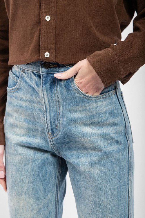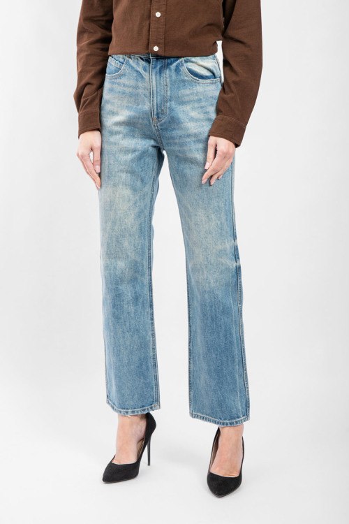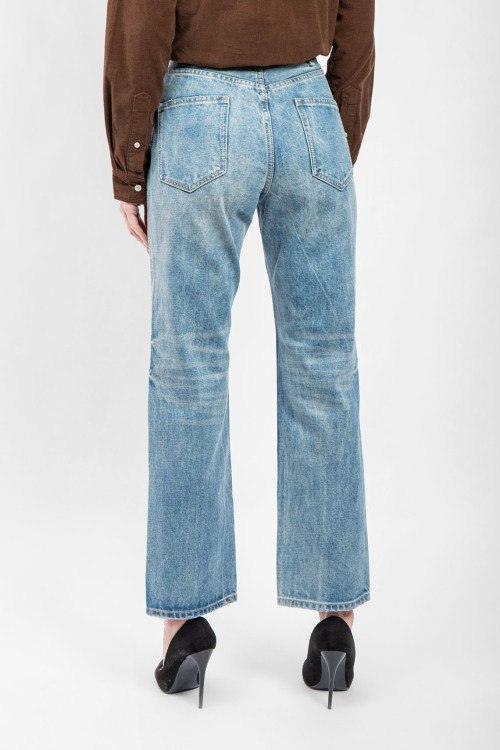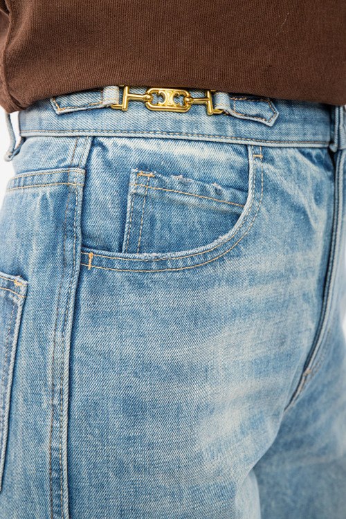 Женские голубые прямые джинсы от Celine (Селин). Пяти-карманная модель, в поясе золотистая фурнитура с логотипом, прямой крой, полная длина.