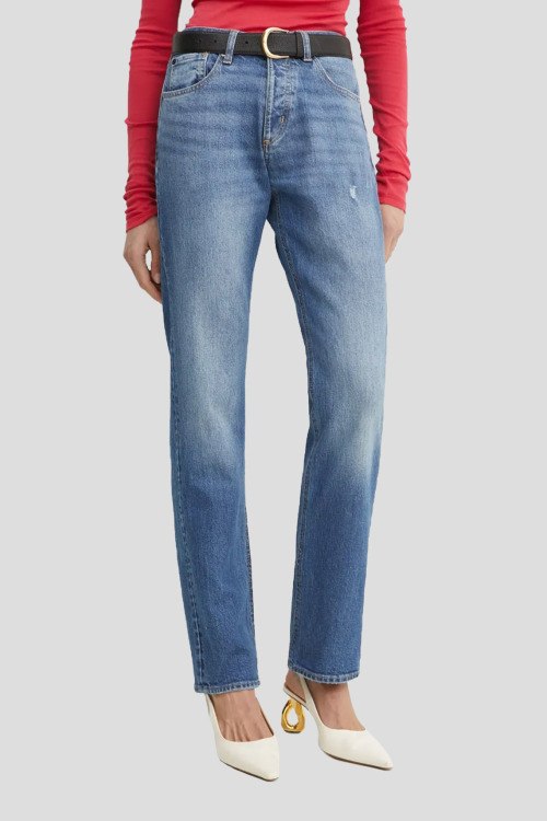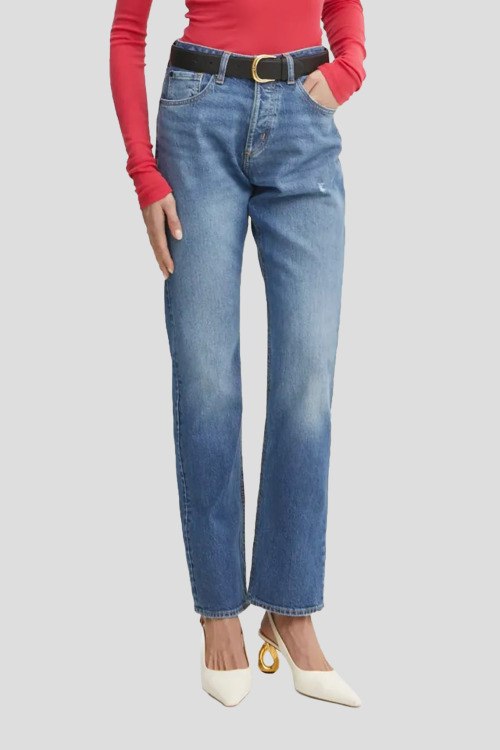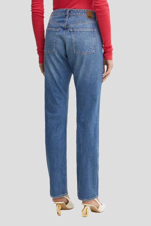 Детали: Женские голубые джинсы от Hugo Boss (Хуго Босс). Пяти-карманная модель, дизайн с потертостями, пояс с петлями для ремня, нашивка с логотипом сзади на поясе, прямой крой, полная длина