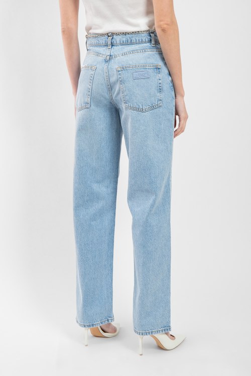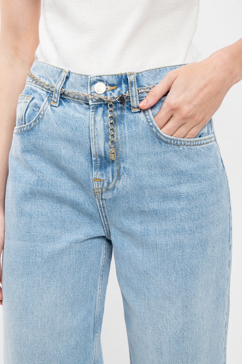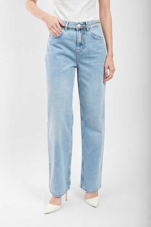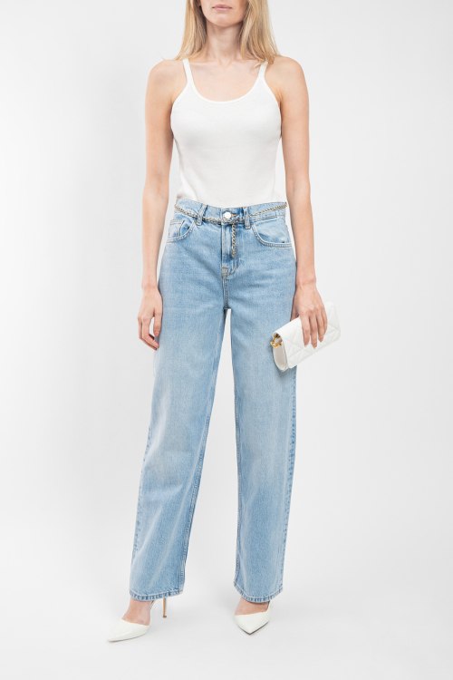 Женские голубые джинсы от Liu Jo (Лиу Джо). Пяти-карманная модель, в поясе с золотистой цепочкой, нашивка с логотипом на заднем кармане, прямой крой, полная длина.