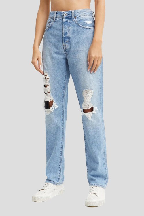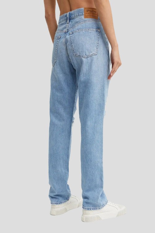 Детали: Женские голубые джинсы из хлопка от Polo Ralph Lauren (Поло Ральф Лорен). Классическая длина, прямой крой, высокая посадка, застежка на молнию и пуговицу, пять карманов, петли в поясе для ремня, дизайн с потертостями, рванные детали