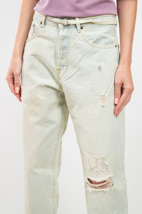 Женские мятные прямые джинсы от Acne Studios (Акне Студиос). Пяти-карманная модель, дизайн с рваными деталями, пояс с петлями для ремня, нашивка с логотипом сзади на поясе, прямой крой, полная длина.