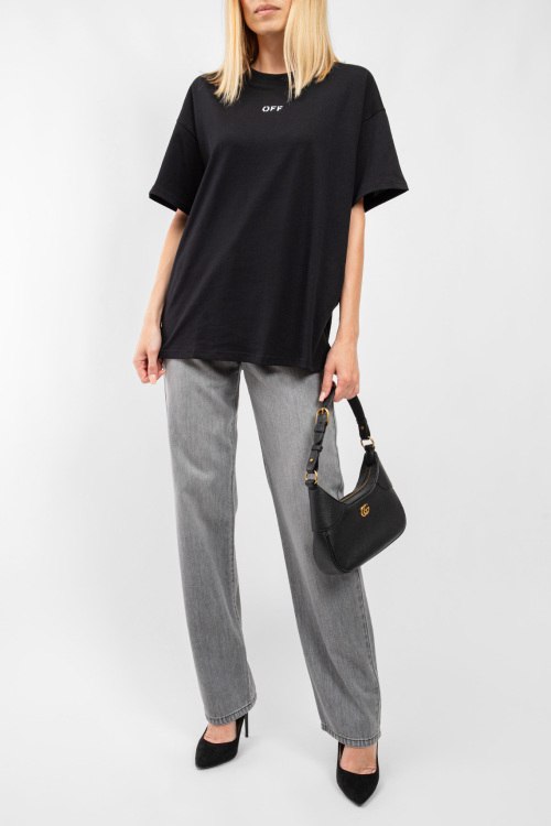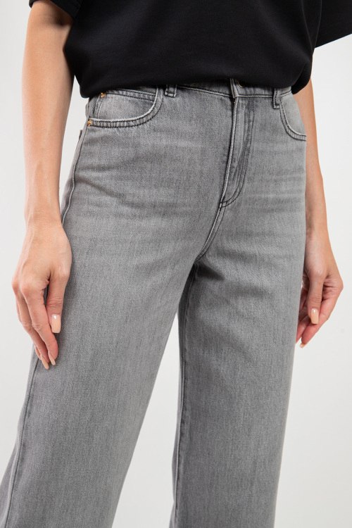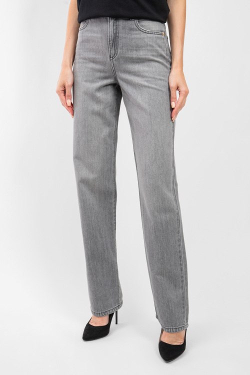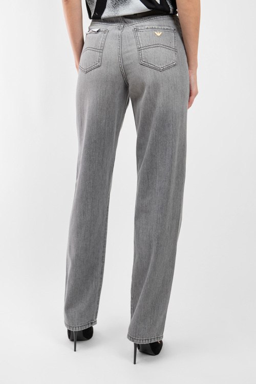 Женские серые прямые джинсы от Armani (Армани). Пяти-карманная модель, пояс с петлями для ремня, логотип на заднем кармане, прямой крой, полная длина.