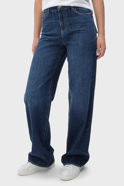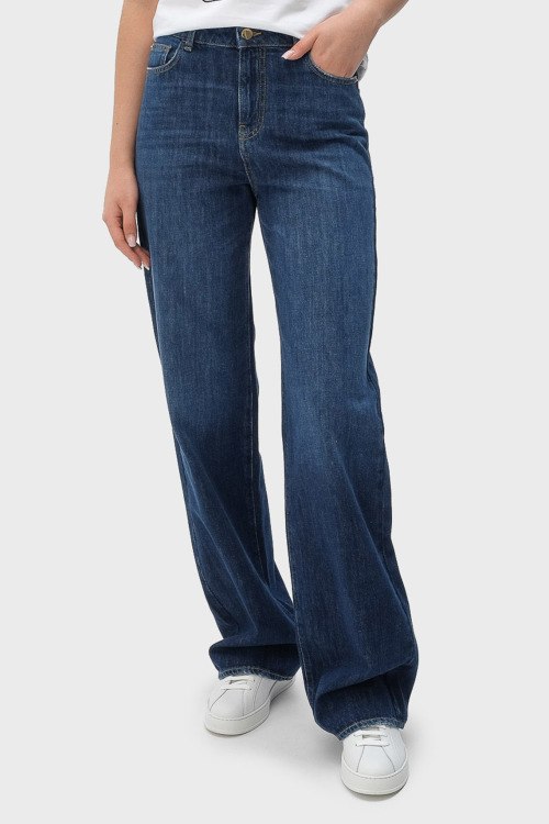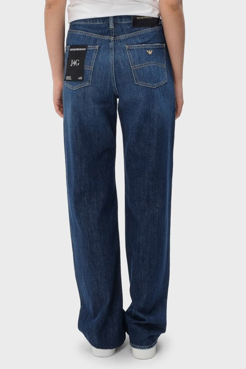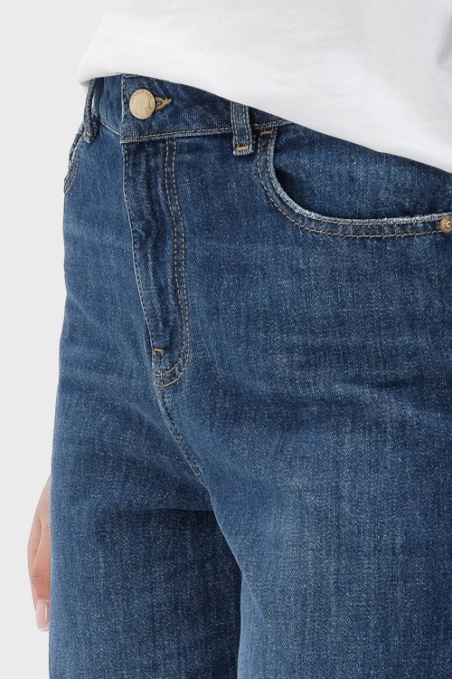 Детали: Женские синие джинсы J4G из хлопка от Emporio Armani (Эмпорио Армани). Прямой крой, высокая посадка, застежка на молнию и пуговицу, пять карманов, петли в поясе для ремня