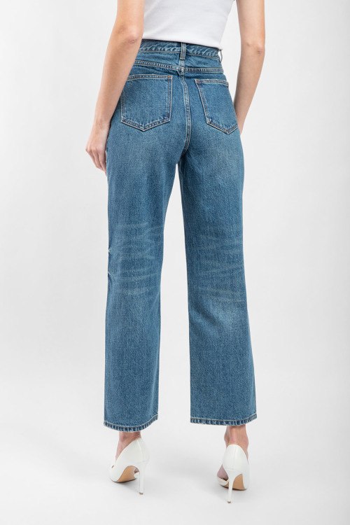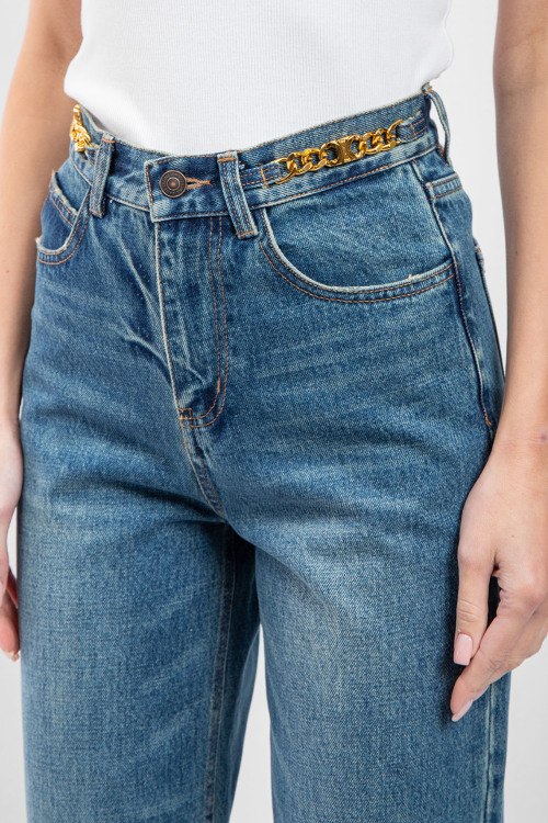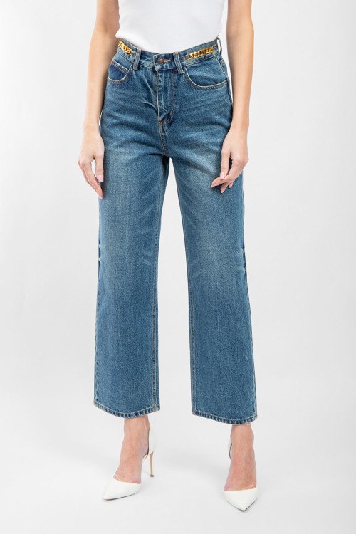 Женские синие прямые джинсы от Celine (Селин). Пяти-карманная модель, пояс с петлями для ремня, золотистые цепочки на поясе, прямой крой, длина до щиколотки.