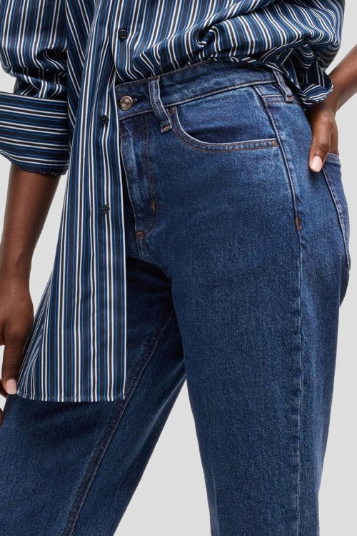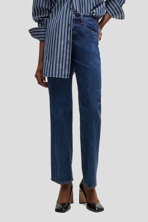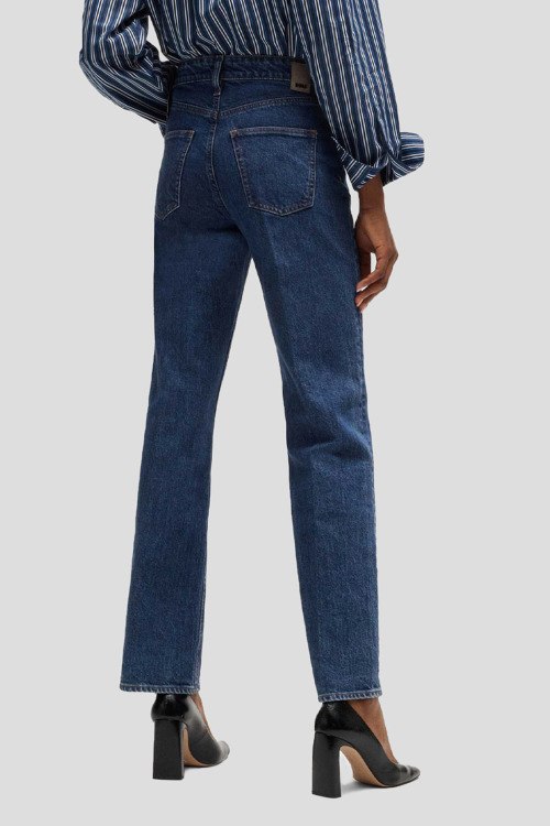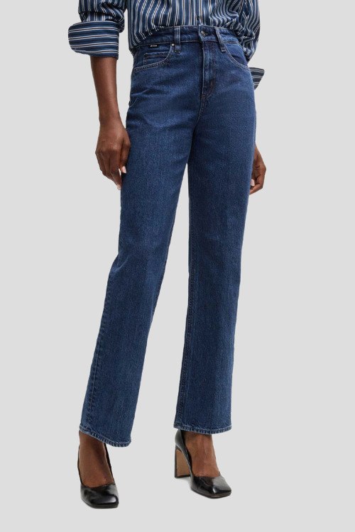 Детали: Женские синие джинсы из хлопкового микса от Hugo Boss (Хуго Босс). Прямой крой, высокая посадка, застежка на молнию и пуговицу, пять карманов, петли в поясе для ремня, патч-лого
