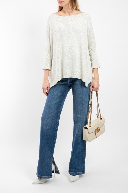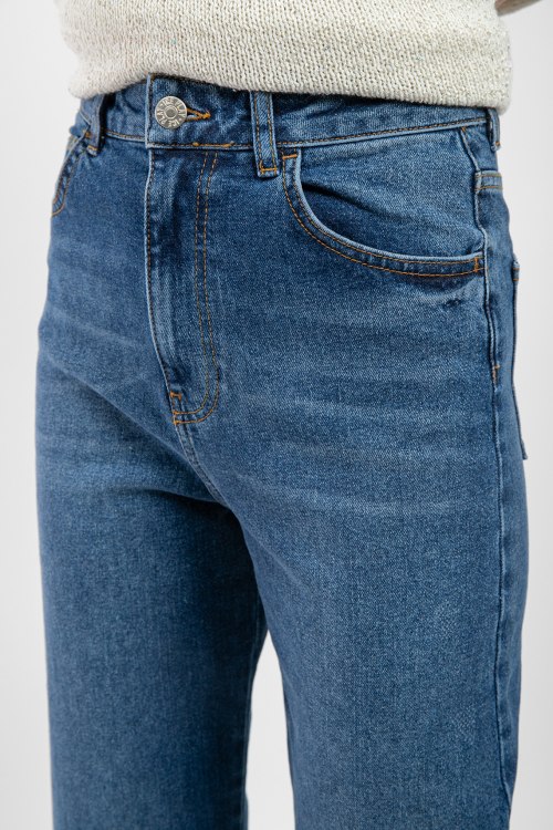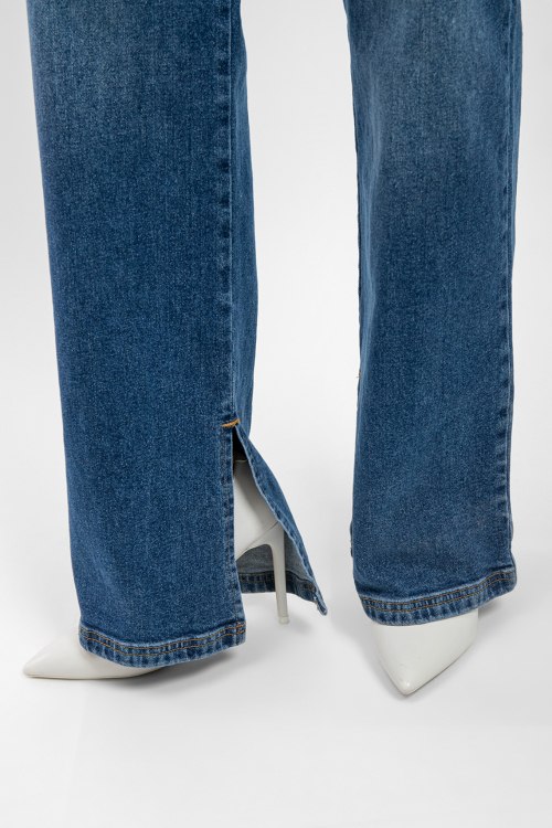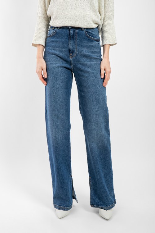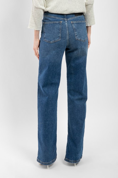 Женские синие джинсы из хлопкового микса от Ice Play (Айс Плей). Высокая посадка, расклешенная модель, манжеты с разрезами, высокая посадка, застежка на молнию и пуговицу, пять карманов, петли в поясе для ремня, патч-лого