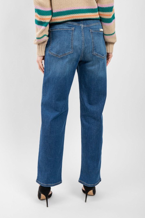 Женские синие джинсы из хлопкового микса от Max Mara (Макс Мара). Классическая длина, высокая посадка, застежка на молнию и пуговицу, четыре кармана, петли в поясе для ремня, патч-лого.