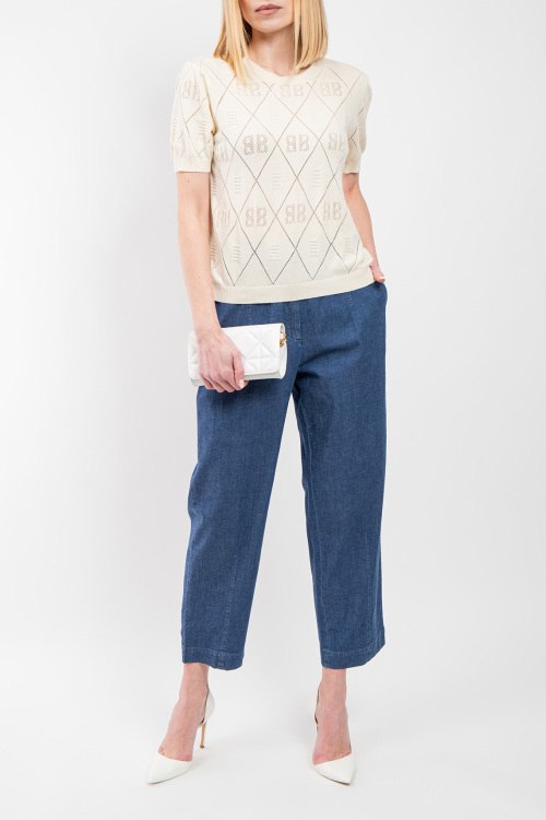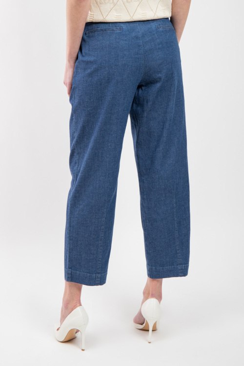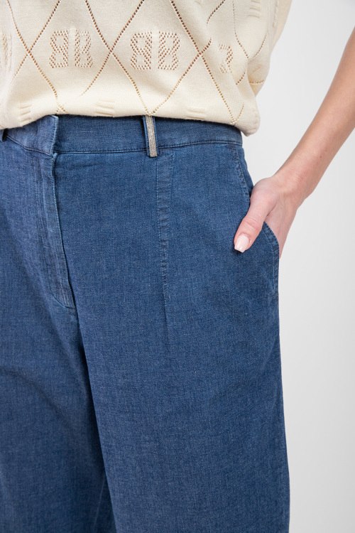 Женские синие джинсы из хлопкового микса от Panicale Cashmere (Паникале Кашемир). Укороченная длина, высокая посадка, застежка на молнию и пуговицу, боковые кармана, петли в поясе для ремня, прямой силуэт. Замеры для размера 44: длина: 98 см, ширина по поясу: 42 см, ширина по бёдрам: 51 см, ширина штанины вверху: 33 см, высота сидения: 37 см.