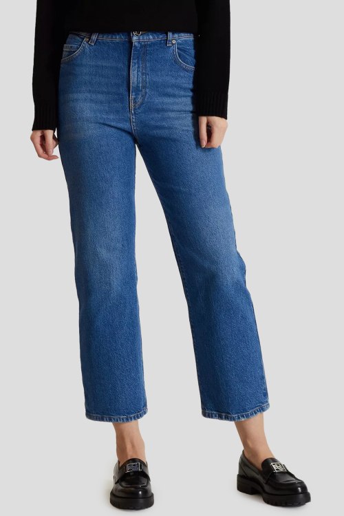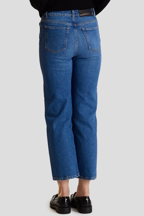 Детали: Женские синие джинсы от Pinko (Пинко). Пяти-карманная модель, пояс с петлями для ремня, нашивка с логотипом сзади на поясе, прямой крой, укороченная длина