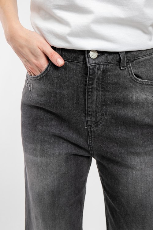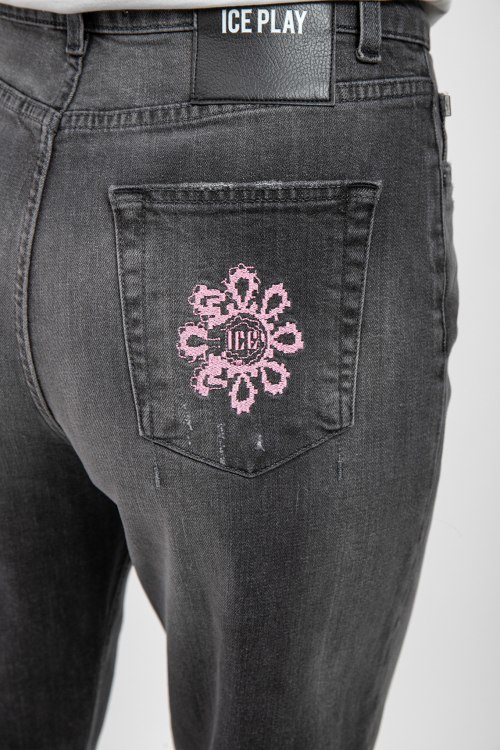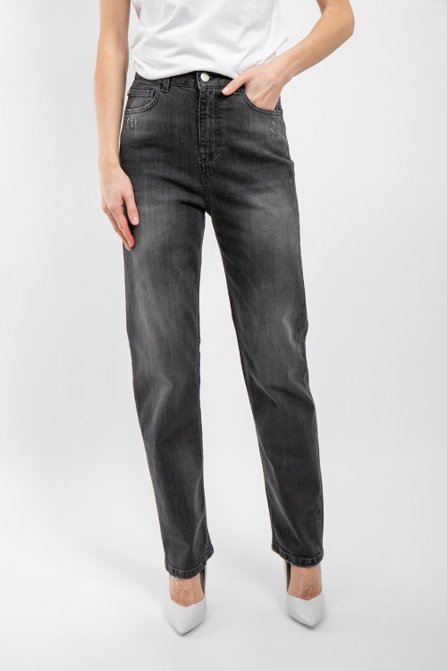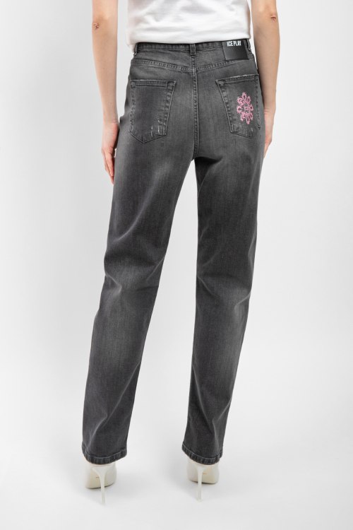 Детали: Женские темно-серые джинсы из хлопкового микса от Ice Play (Айс Плей). Классическая длина, застежка на молнию и пуговицу, пять карманов, высокая посадка, петли в поясе для ремня, вышивка на заднем кармане