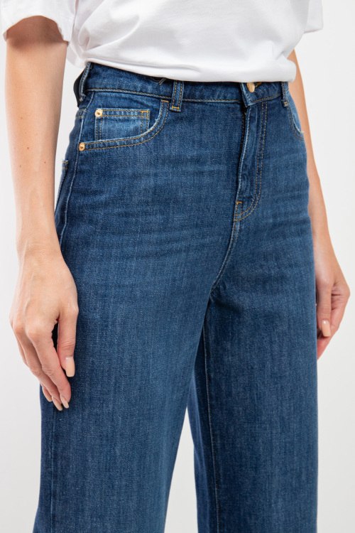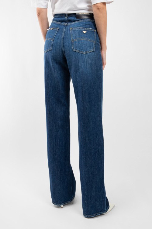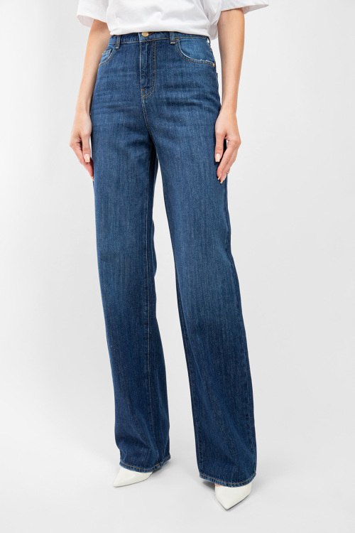 Женские темно-синие прямые джинсы от Emporio Armani (Эмпорио Армани). Пяти-карманная модель, высокая талия с петлями для ремня, логотип на заднем кармане, прямой крой, полная длина.