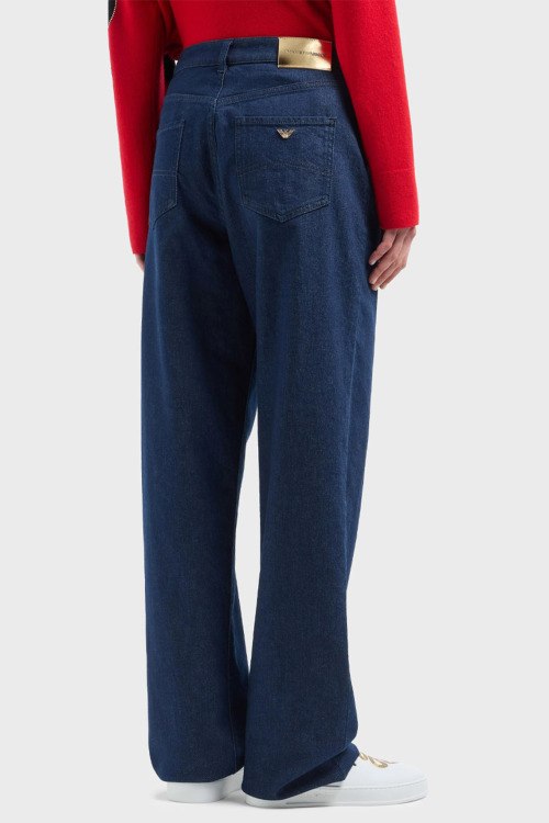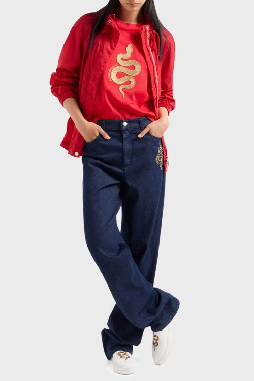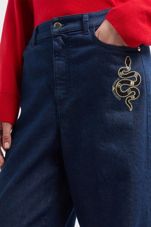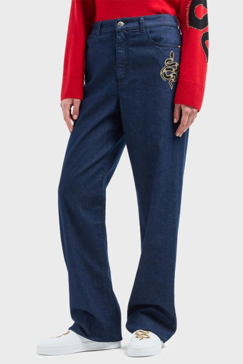 Детали: Женские темно-синие джинсы от Emporio Armani (Эмпорио Армани). Пяти-карманная модель, вышитая змея, пояс с петлями для ремня, нашивка с логотипом сзади на поясе, прямой крой, полная длина