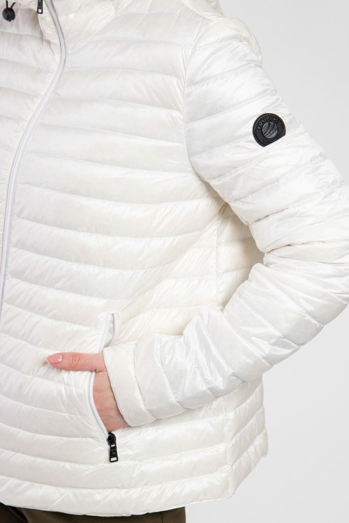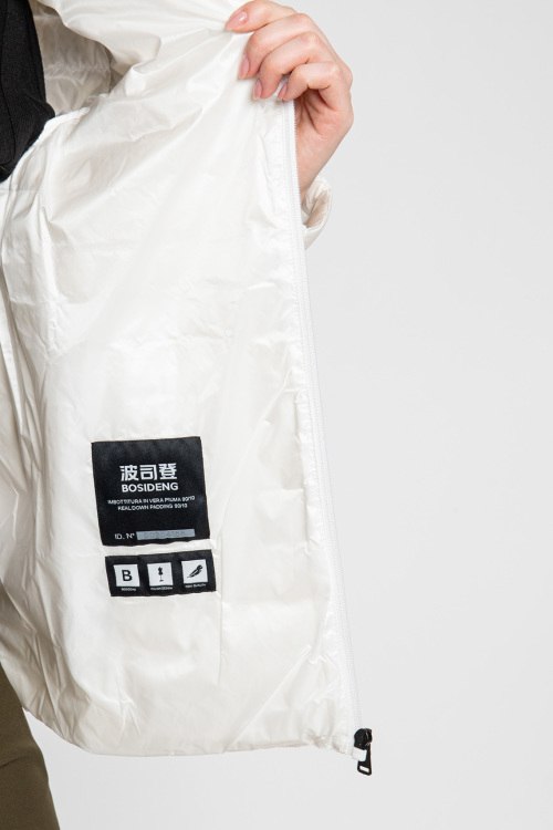 Женская белая куртка из нейлона от Bosideng (Босиден). Стеганый дизайн, застежка на молнию, вшитый капюшон, боковые карманы на молнии, патч-лого на рукаве, модель утепленная миксом из пуха и пера. После специальной обработки изделия остаются «дышащими», непромокаемыми и эластичными. Они не деформируются после стирки, пух не «оплывает» и не вылезает из швов. И по весу они очень легкие.