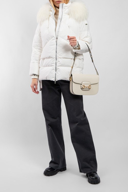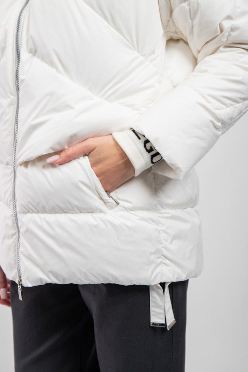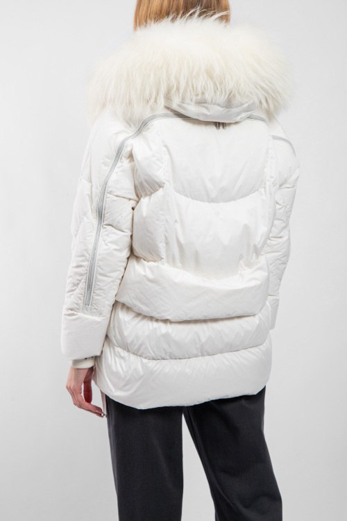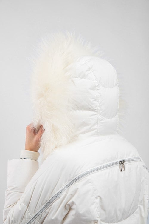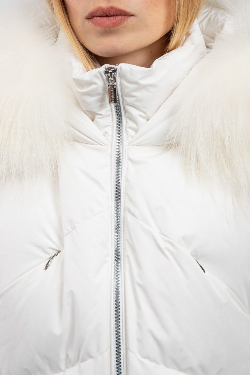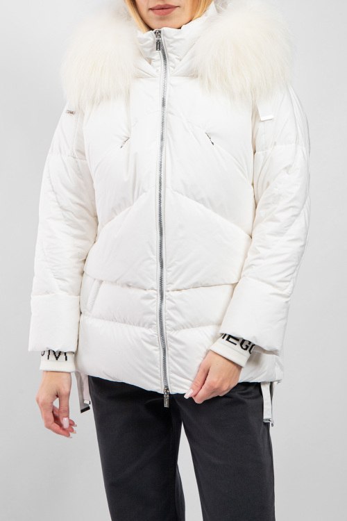 Женская белая куртка на пуху от Diego M (Диего М). Стеганый дизайн, вшитый капюшон со съемным мехом на пуговицах, четыре передних кармана, застежка-молния, брендированные трикотажные манжеты, удлиненная длина, наполнитель из микса пуха и пера. Замеры для размера 38: длина: 65 см, ширина груди 58 см, ширина по талии 58 см, длина по внутреннему шву рукава 44,5 см, ширина рукава 21 см.