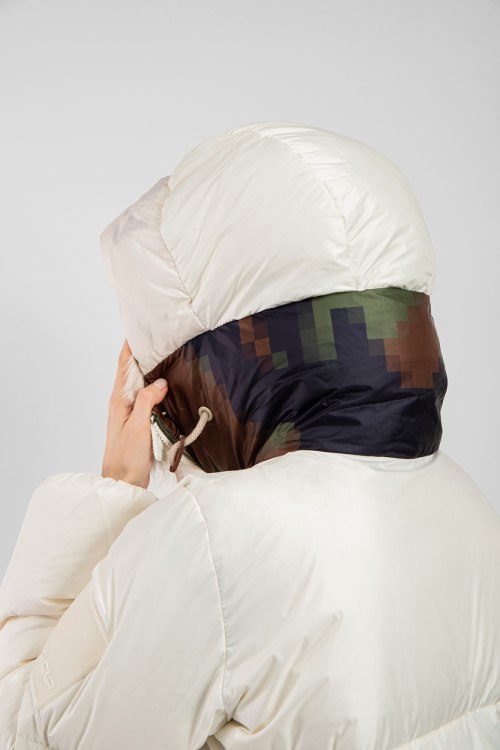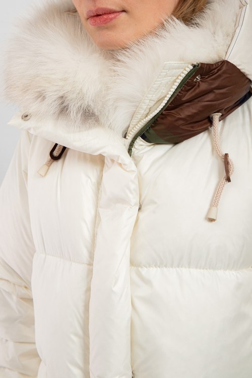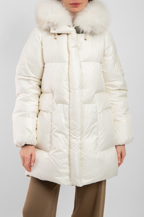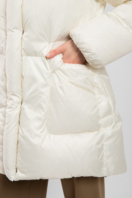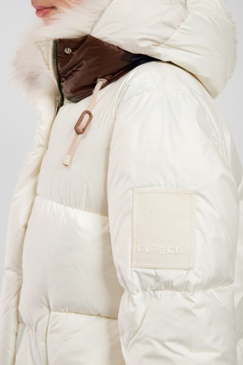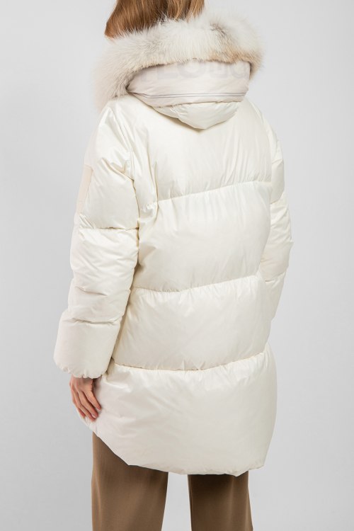 Женская белая куртка из полиэстера от Flo & Clo (Фло энд Кло). Стеганый дизайн, застежка на молнию и кнопки, вшитый капюшон, съемный мех, накладные карманы с клапаном, удлиненная длина, модель утепленная пухом. Замеры для размера 44: длина изделия: 80 см, ширина по груди: 55 см, ширина по талии: 58,5 см, ширина по бедрам: 61 см, длина рукава по внутреннему шву: 51 см, ширина рукава: 23,5 см, ширина по плечам: 40,5 см.