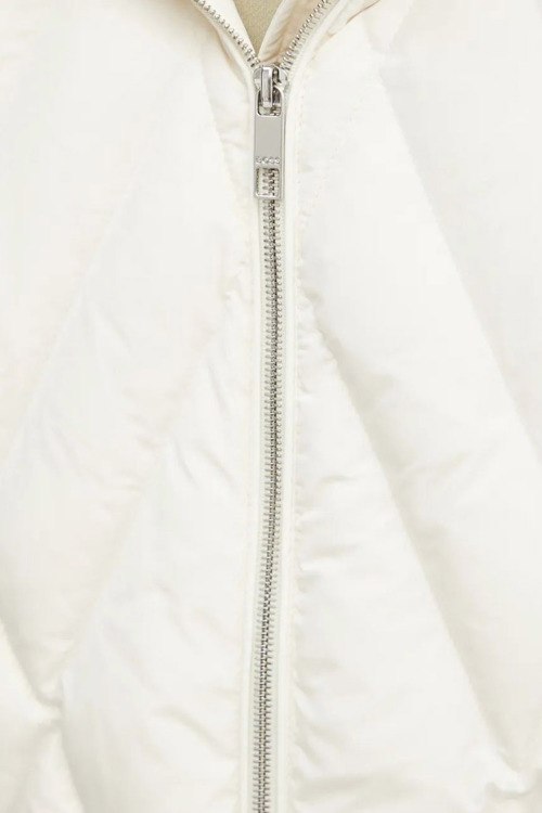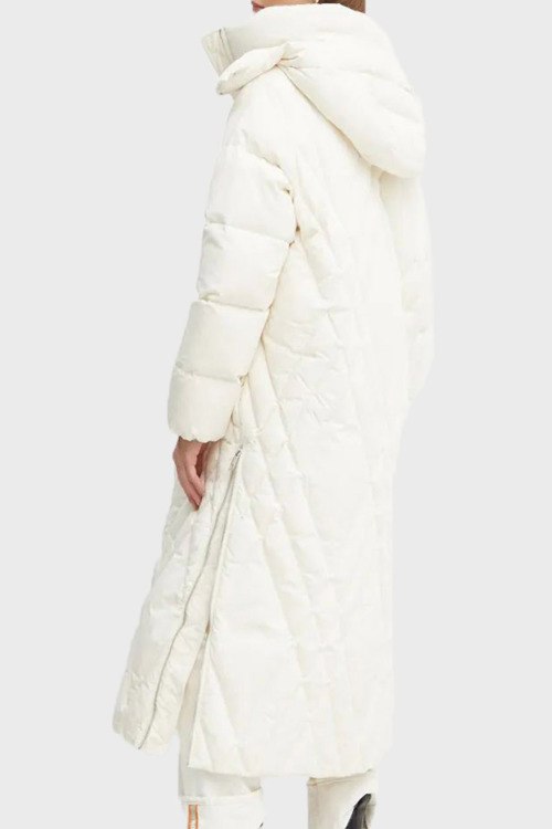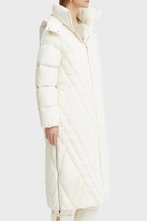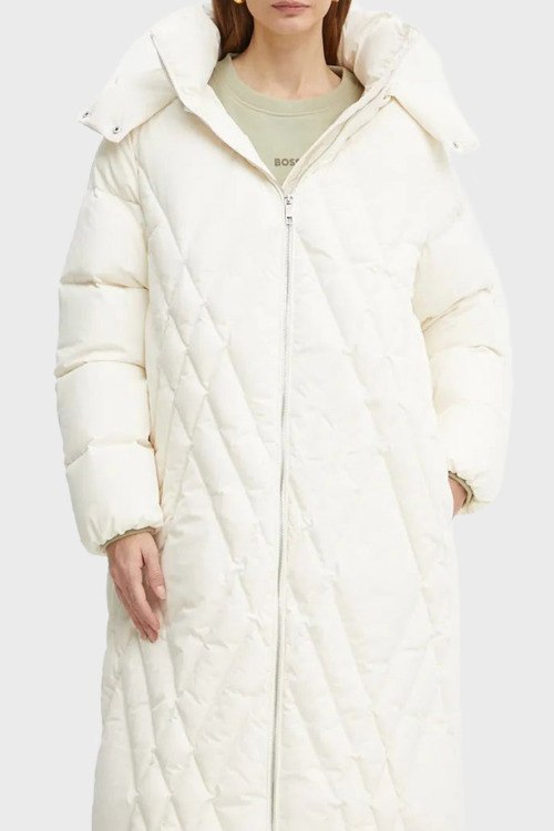 Детали: Женское белое пальто из полиамида от Hugo Boss (Хуго Босс). Длина миди, стеганый дизайн, высокий воротник-стойка, застежка на молнию, съемный капюшон, прорезные карманы, по бокам застежка на молнию, модель утепленная миксом из пуха и пера