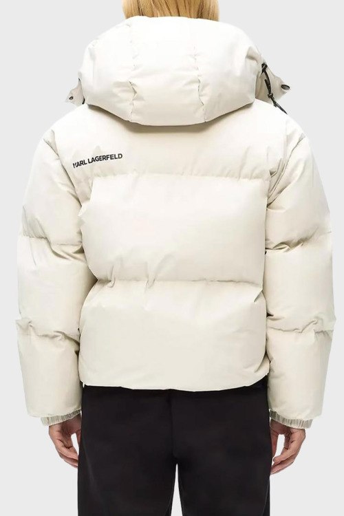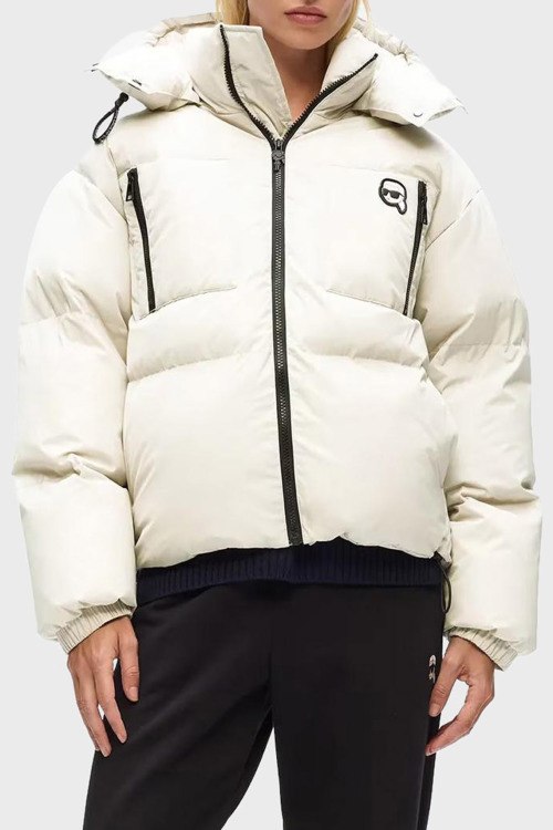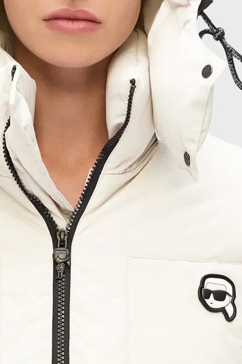 Детали: Женская белая зимняя куртка Ikon от Karl Lagerfeld (Карл Лагерфельд). Дутый материал, высокий воротник, вшитый капюшон, логотип на груди, четыре кармана, застежка-молния, манжеты на резинке, синтетический утеплитель, классическая длина