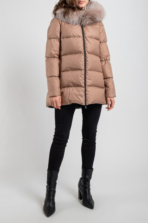 Детали: Женская бежевая куртка с наполнителем из пуха и пера от Blanchett Goose (Бланшет Гус). Удлиненная модель, вшитый капюшон, застежка на молнию, стеганный дизайн, два прорезных кармана на молнии, меховая отделка на капюшоне.