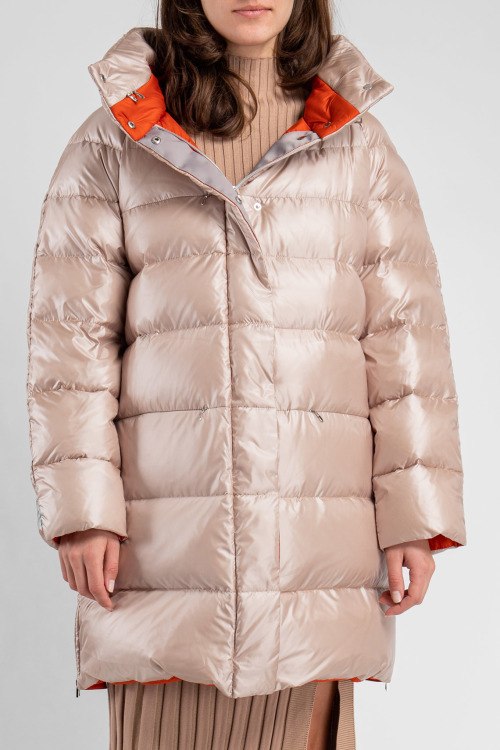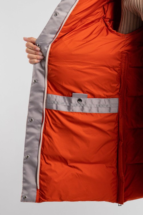 Женская бежевая куртка из нейлона от Diego M (Диего М). Классическая длина, стеганый дизайн, высокий воротник-стойка, застежка на молнию и кнопки, съемный капюшон, карманы на молнии, модель утепленная миксом из пуха и пера.