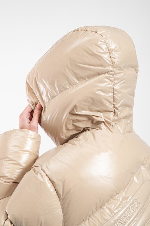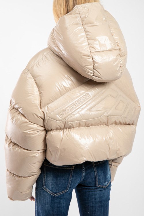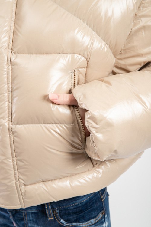 Женская бежевая куртка из полиэстера от Dsquared2 (Дискваред). Укороченная длина, стеганый дизайн, высокий воротник-стойка, застежка на молнию и кнопки, вшитый капюшон, прорезные карманы, модель утепленная миксом из пуха и пера.