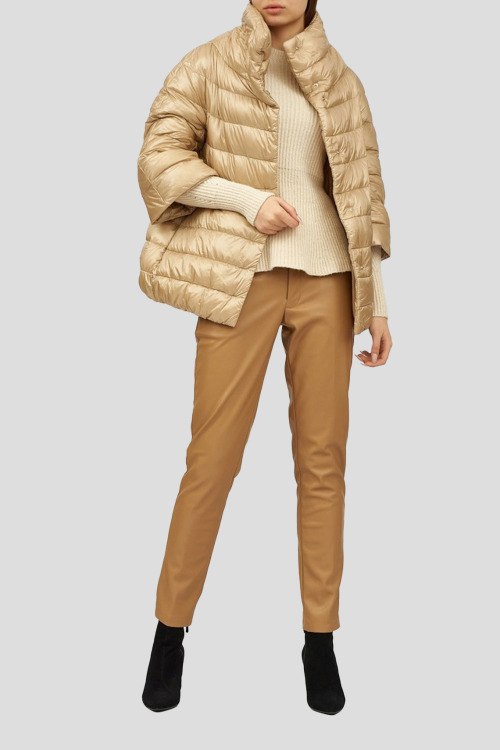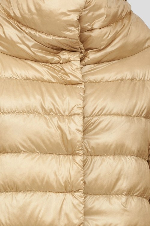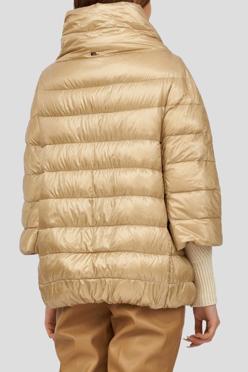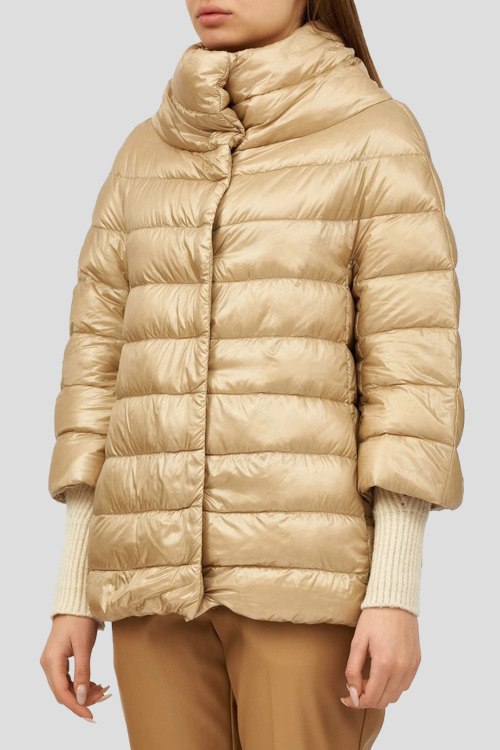 Детали: Женская бежевая куртка из полиамида от Herno (Эрно). Стеганая модель, классическая длина, свободный фасон, рукава 3/4, высокий воротник-стойка, застежка на кнопки, два внешних кармана, натуральный утеплитель